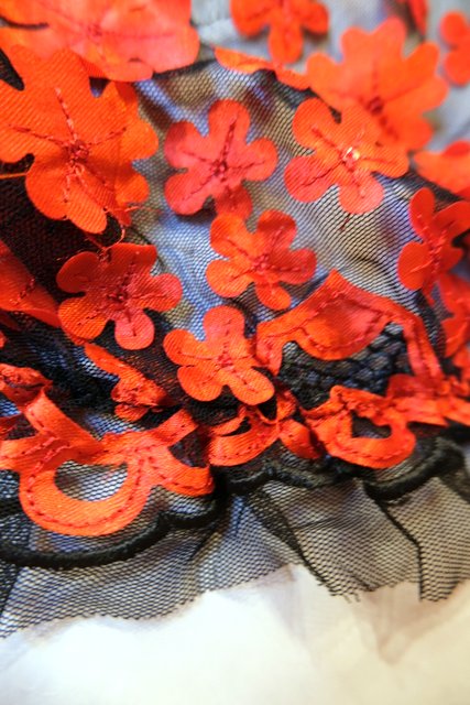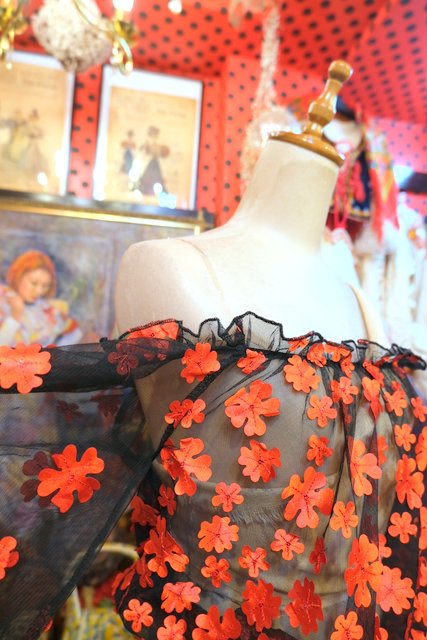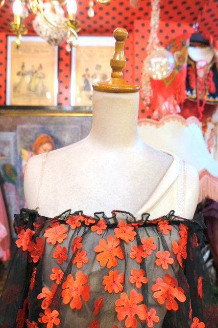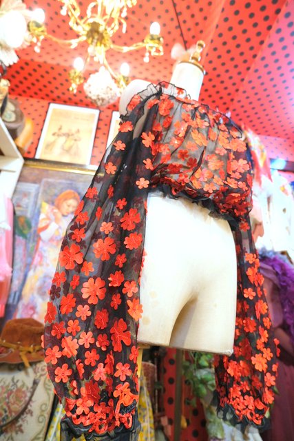 首から肩にかけてスッキリ魅せしてくれるオフショルダーに透け感がある黒×赤いお花デザインが目を惹くヨーロピアンシースルートップス