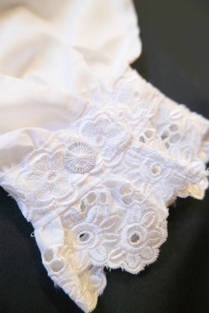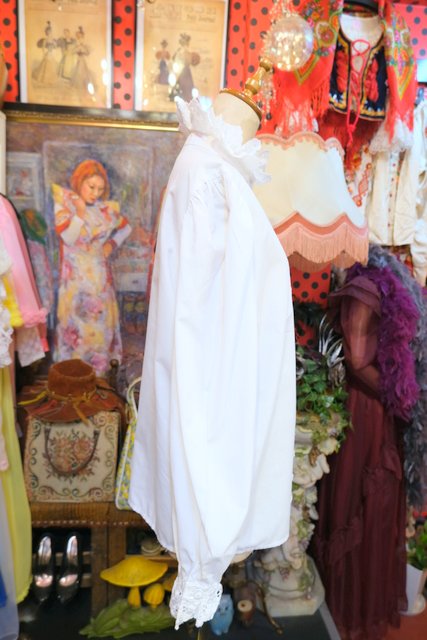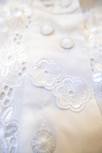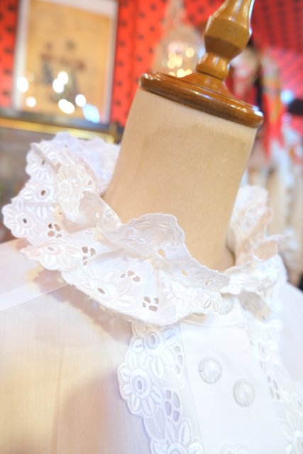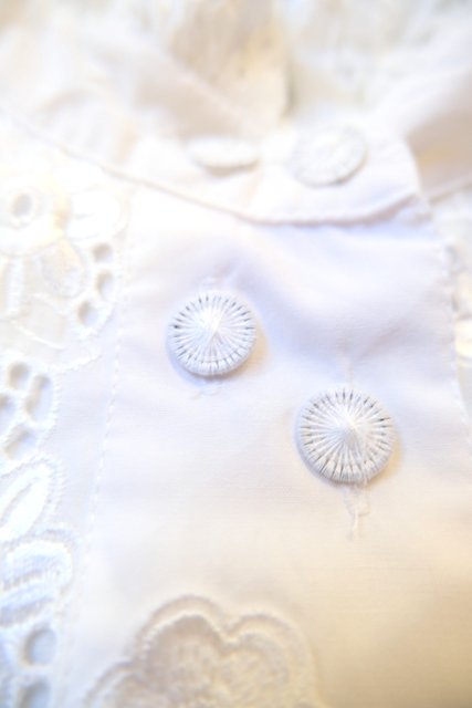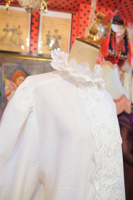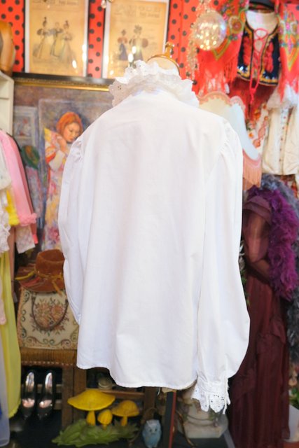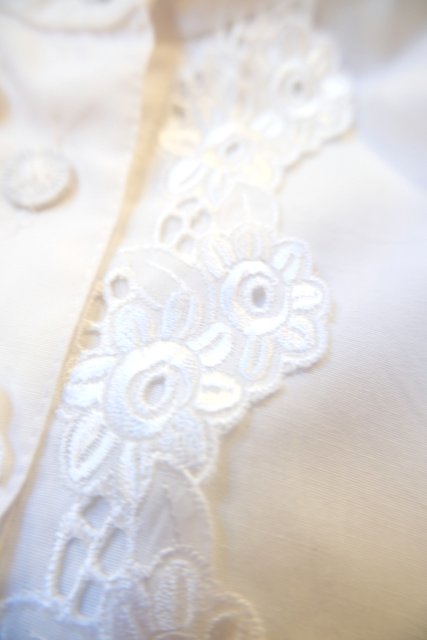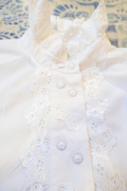 華やかで張り感のある2枚重ねの花柄レース襟にアンティーク感漂う斜めデザインの糸ボタンがお洒落な1980年代頃のヨーロピアンヴィンテージチロルブラウス デニムと合わせてボーイッシュ×ノーブルなスタイルもおススメ!