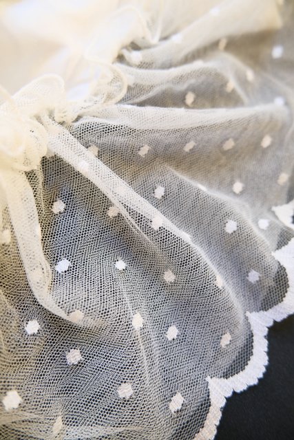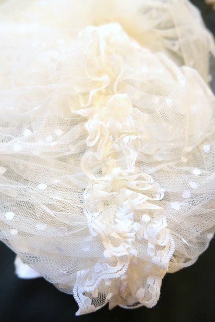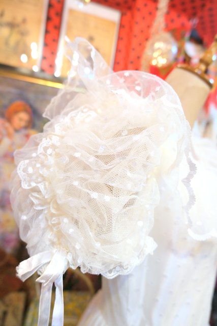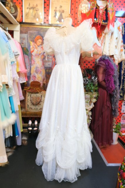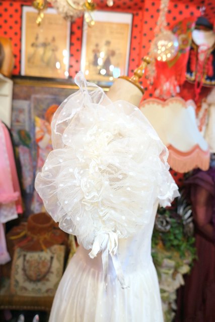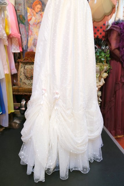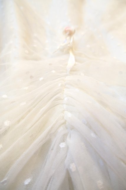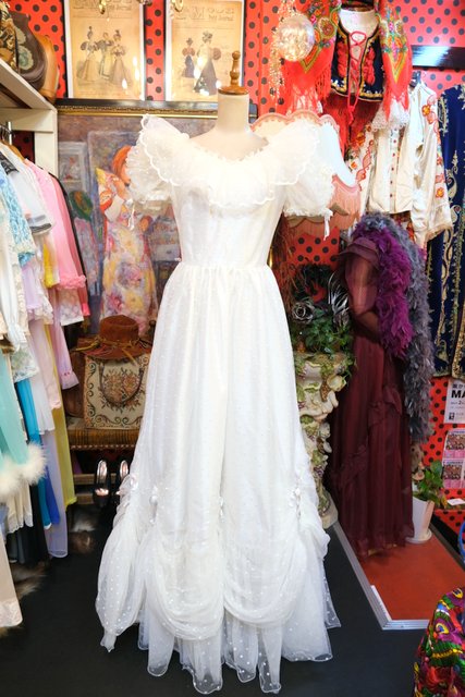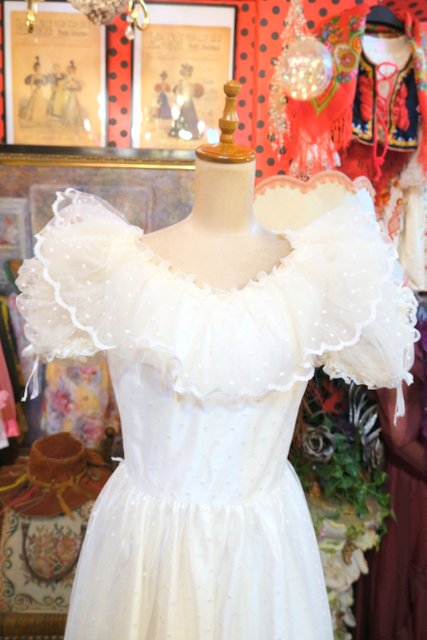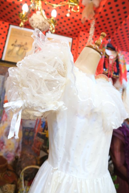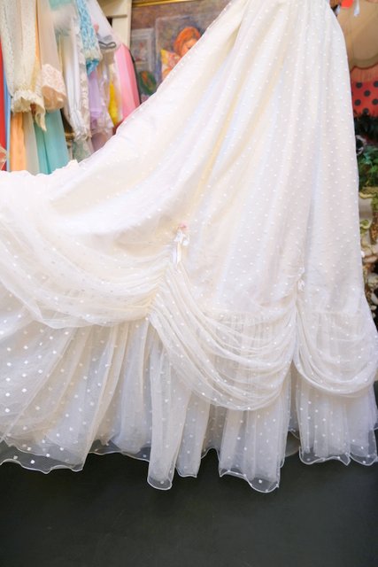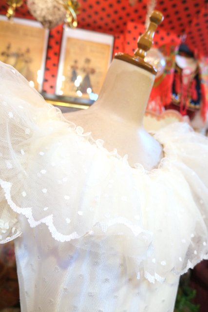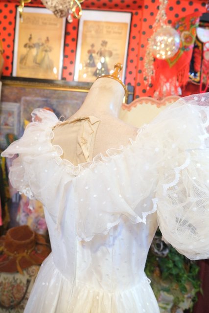 ロマンティックでエアリーな水玉チュール生地にハードチュール入りのボリューミーなパフスリーブやラッフルカラー、ギャザーをよせたドレープデザインがメルヘンチックな世界観を演出してくれる1970年代頃のヨーロピアンヴィンテージプリンセスウエディングドレス
