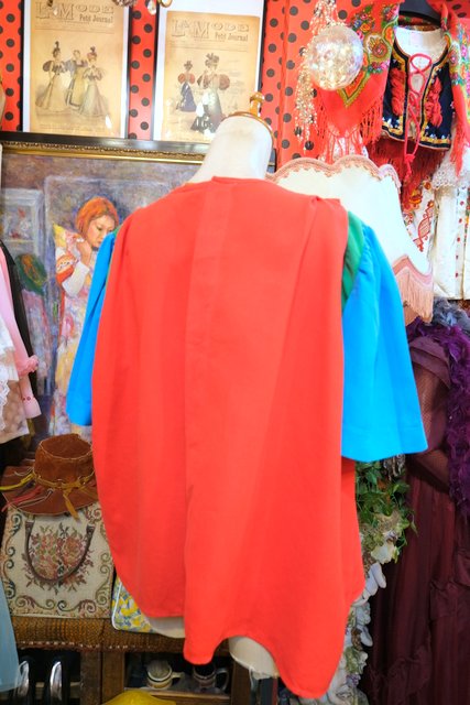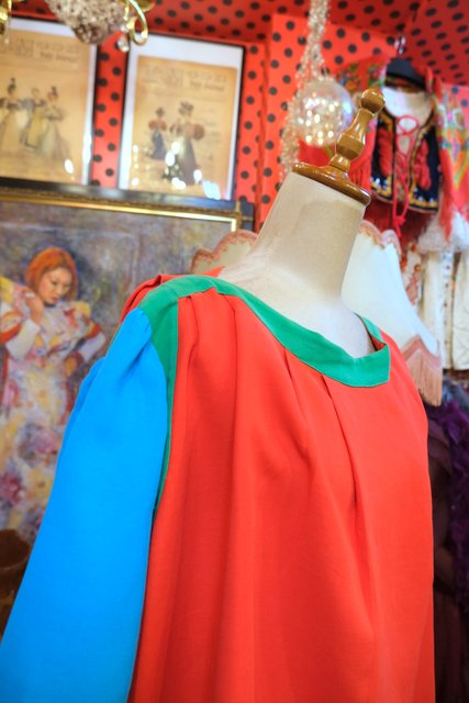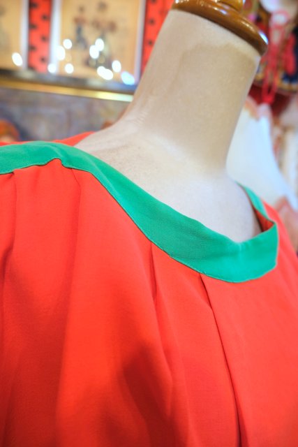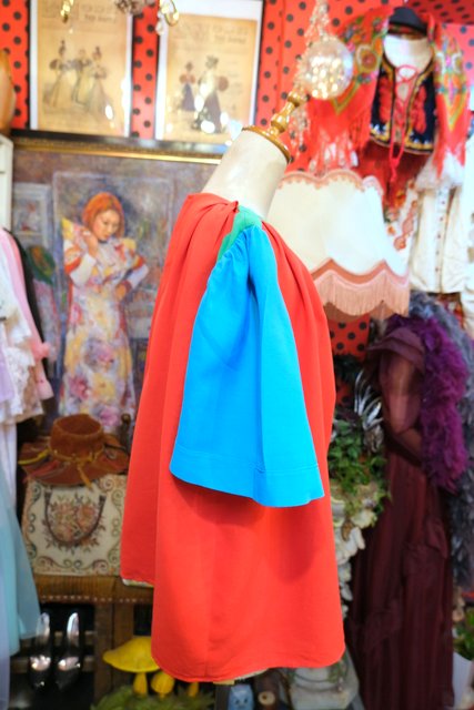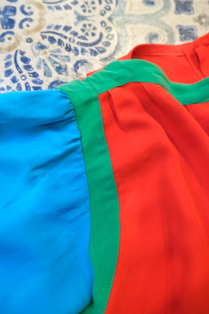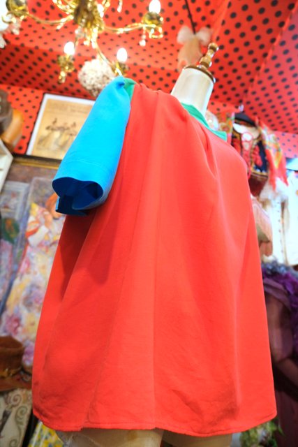 赤×グリーン×水色のカラフルポップカラーに首周りのタックデザインがお洒落なヨーロピアンハンドメイドシャツ ★SALE★