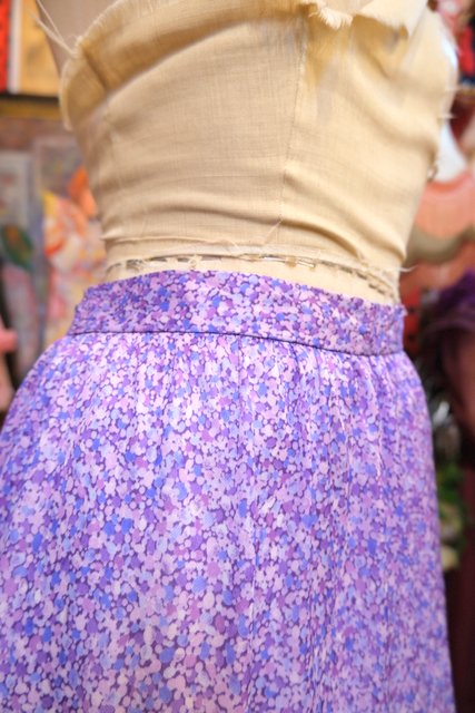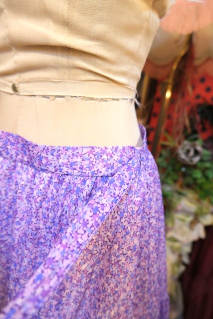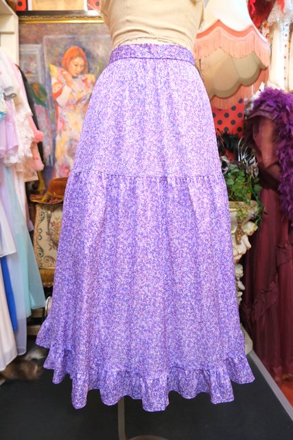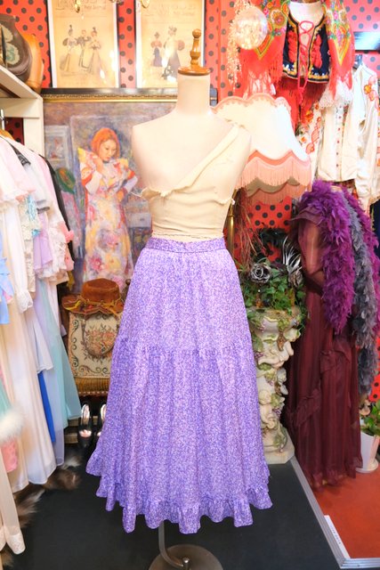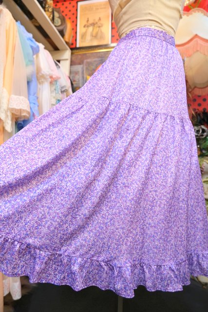 パープルMIXカラーのドットのような総柄プリントに裾のフリルデザインが可愛らしい1970年代頃のヨーロピアンヴィンテージスカート