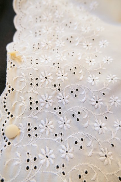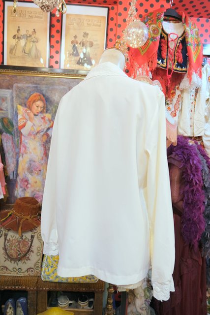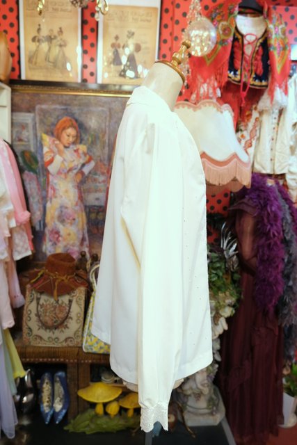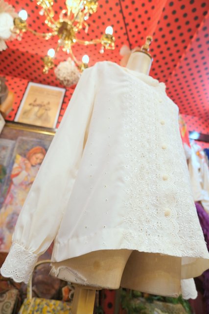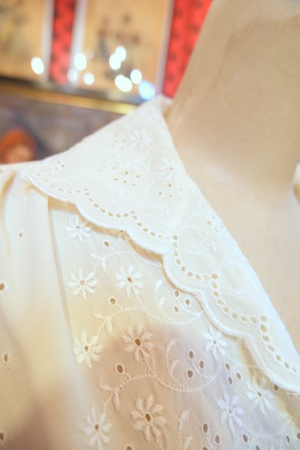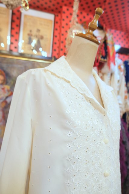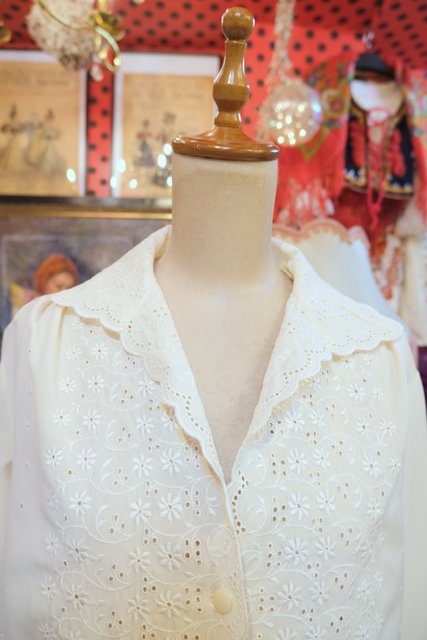 アンティーク感漂うきなり色にお花刺繍カットワークデザインやスカラップ襟が可愛らしい1970年代頃のヨーロピアンヴィンテージブラウス