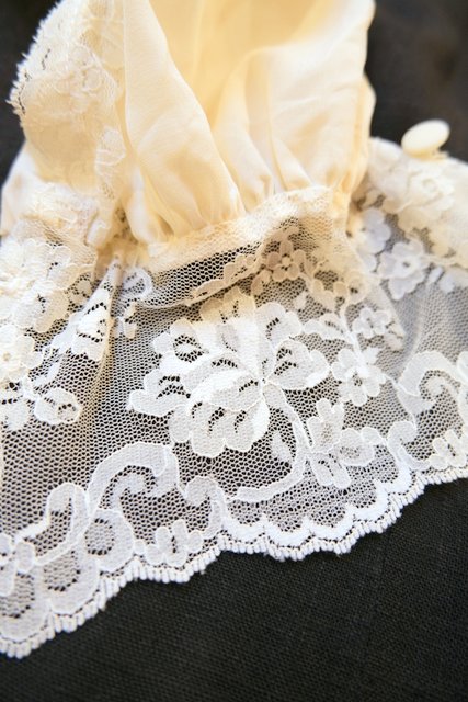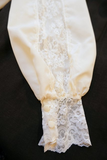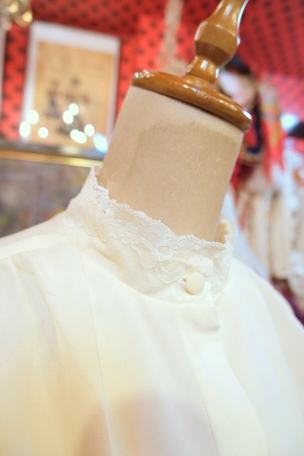 アンティーク感漂うきなり色ベースに上品な印象のレース付きスタンドカラーや繊細なレースカフス×袖の透け感が魅力的な1970年代頃のヨーロピアンヴィンテージブラウス