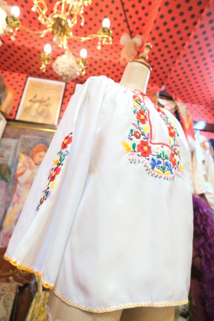 カラフルなお花刺繍やステッチにフレア袖がレトロ感たっぷりの1970年代ヨーロピアンヴィンテージチュニック ガーリーなボトムやデニム、ミリタリー系のボトムスでも相性◎!