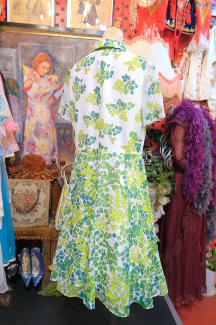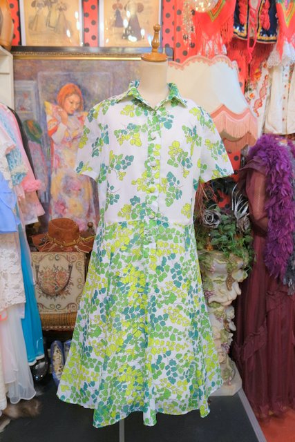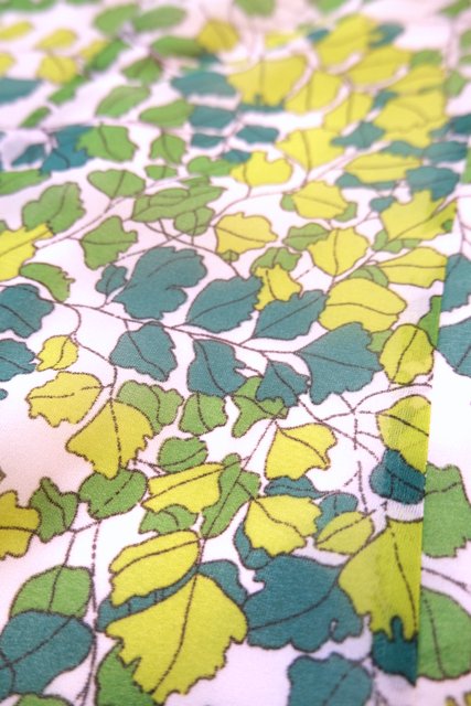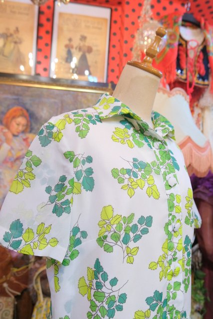 レトロ感たっぷりのリーフ総柄に涼し気な透け感が魅力的な1970年代頃のヨーロピアンヴィンテージワンピース