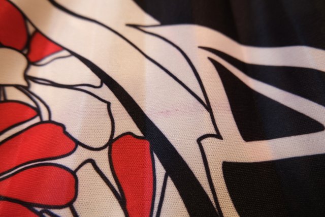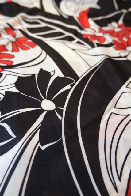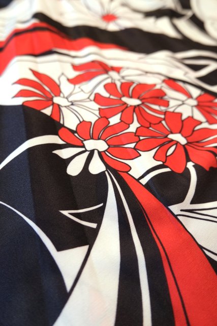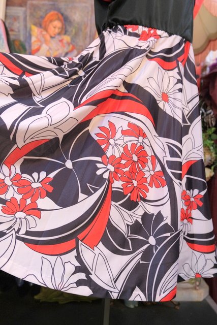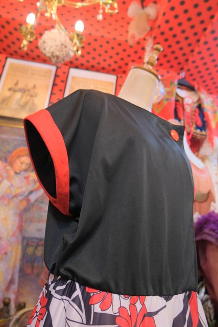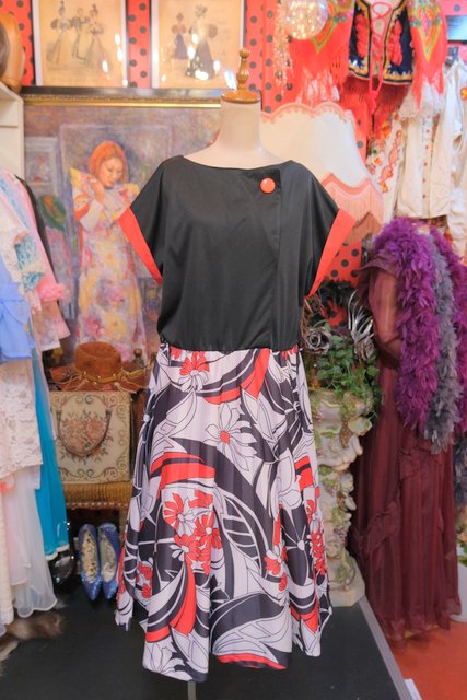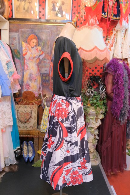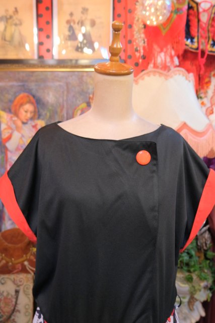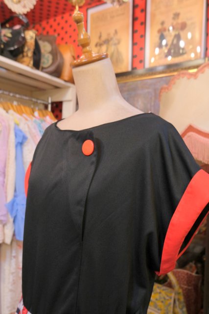 黒と赤のドルマンスリーブトップス×モダンな花柄スカートが魅力的な1980年代頃のヨーロピアンヴィンテージワンピース