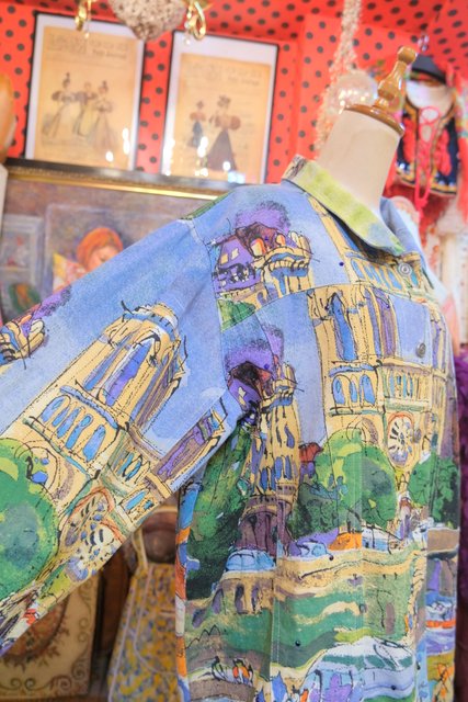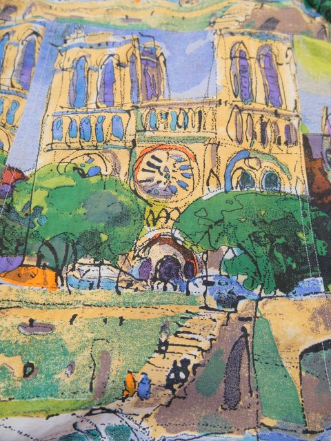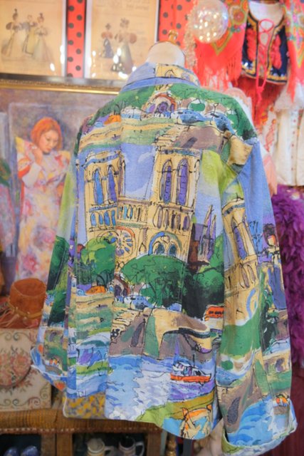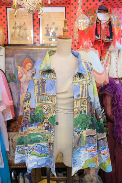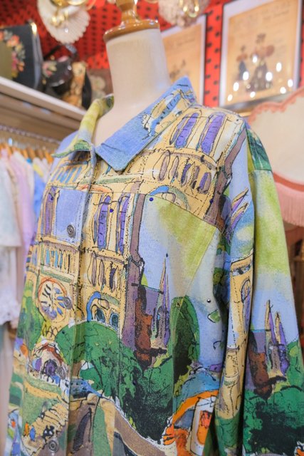目を惹くパリのノートルダム大聖堂が描かれた1980~90年代頃のヨーロピアンオーバーサイズジャケット 小さなラインストーン付きがポイント!