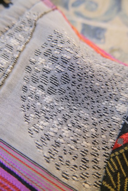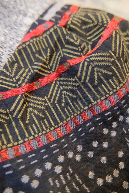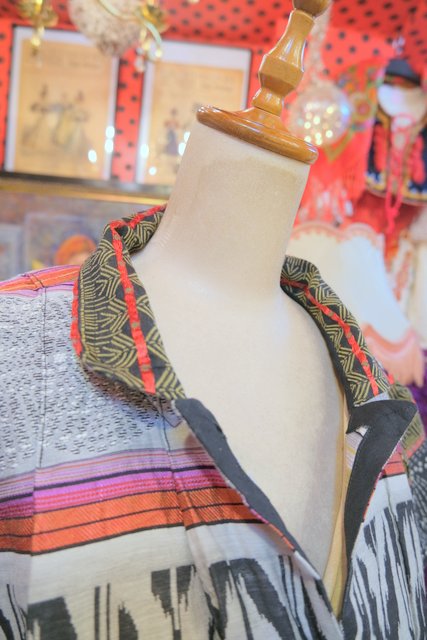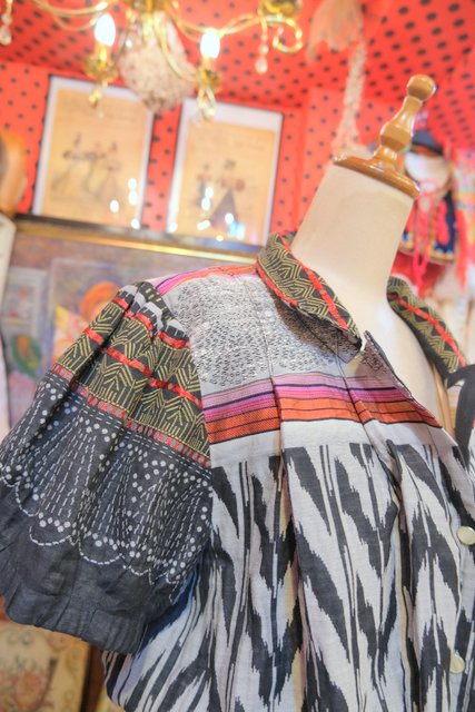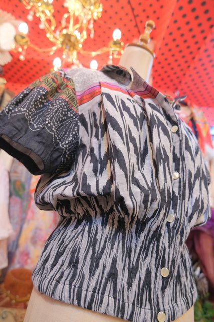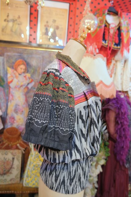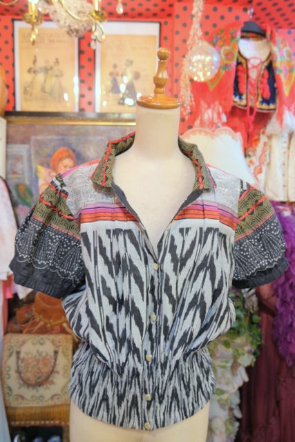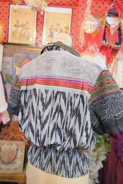 モダンな刺繍入りエスニック生地にウエストのシャーリングデザインがお洒落なフランス製ヴィンテージデザイナーシャツジャケット