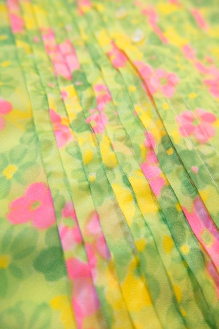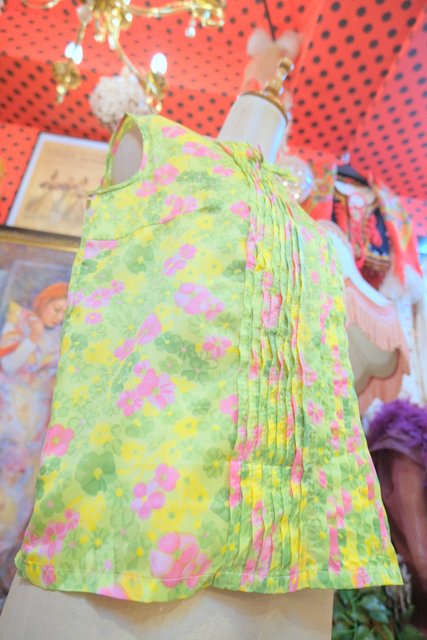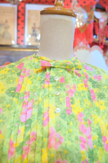 黄緑色ベースにレトロな花柄プリントや前立てプリーツ×リボンデザインが可愛らしい1960~70年代頃のヨーロピアンヴィンテージトップス