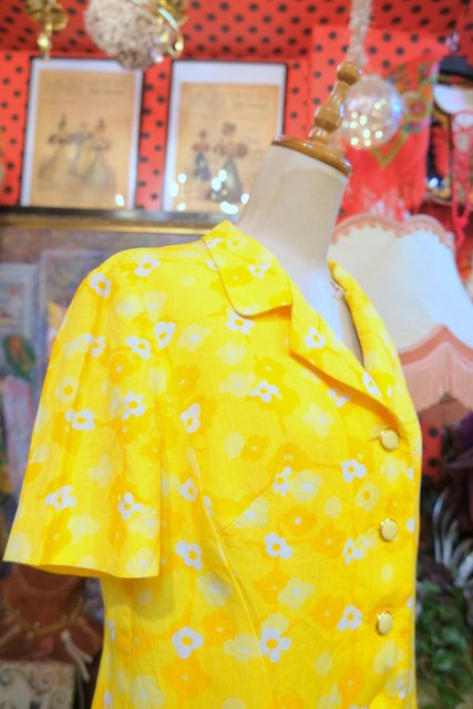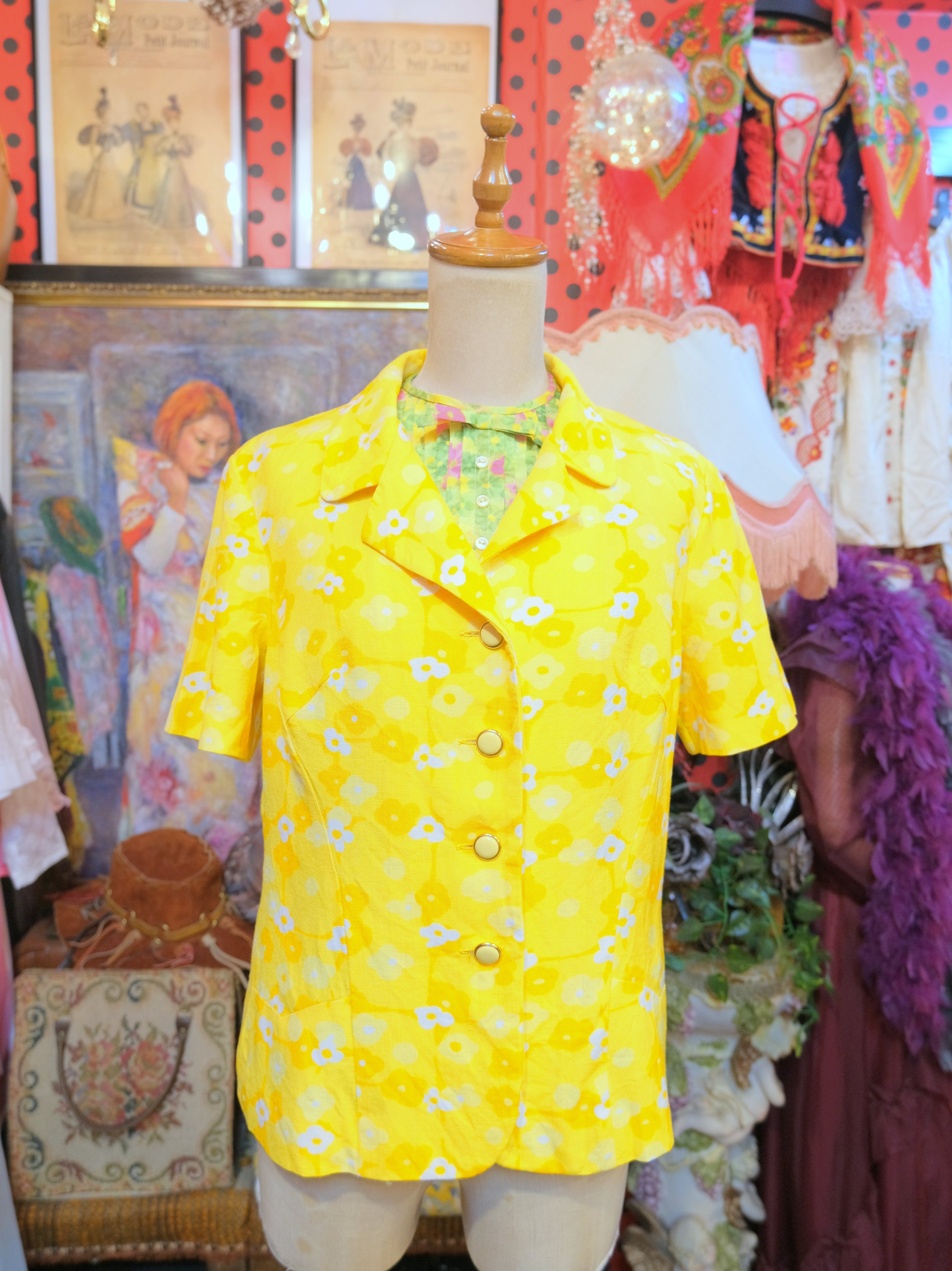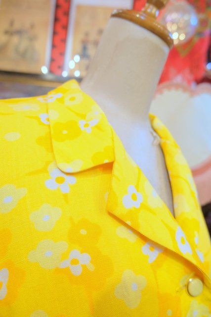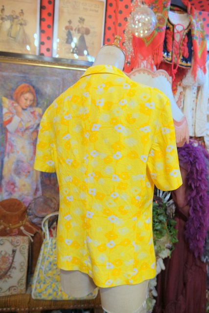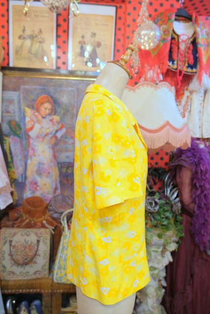 カラフルなイエローベースにレトロポップな花柄プリントやボタンが可愛らしい1960~70年代頃のヨーロピアンヴィンテージ半袖ジャケット