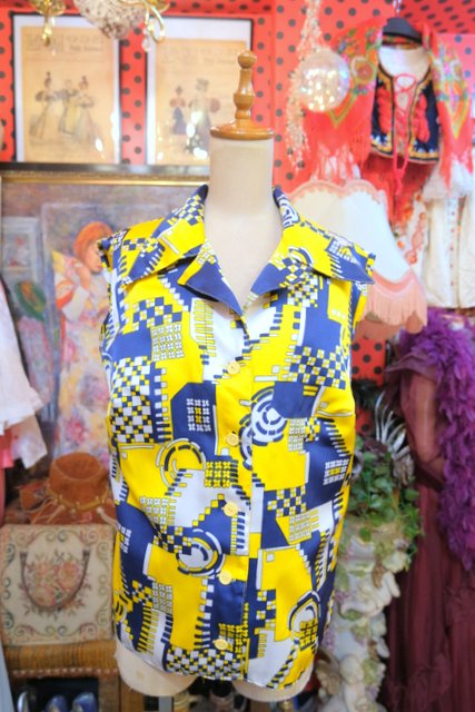 レトロポップな総柄に先が尖った大きな襟がお洒落な1970年代頃のヨーロピアンヴィンテージノースリーブトップス