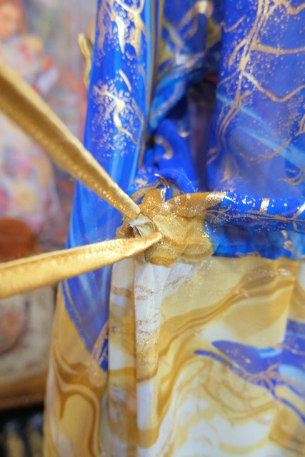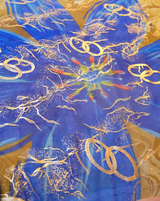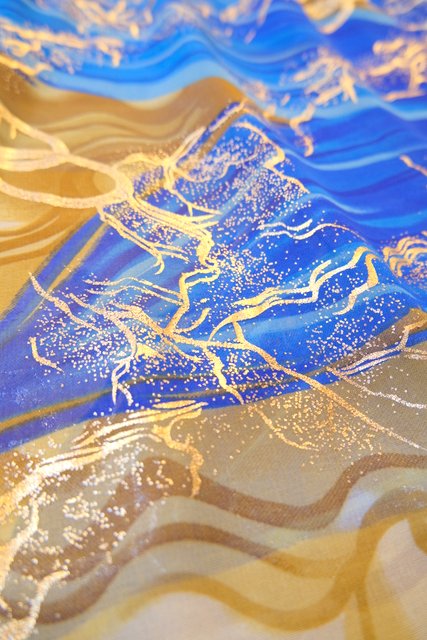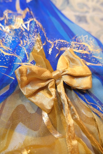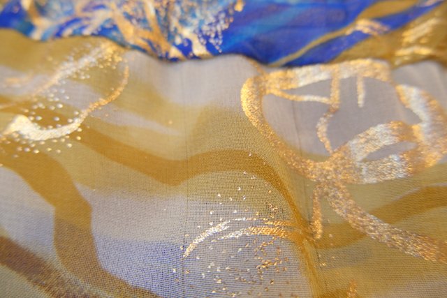 べージ茶系×ブルー×ゴールドの大輪の花風なアートプリントに袖やリボンデザインがお洒落なヨーロピアンエスニックロングドレス