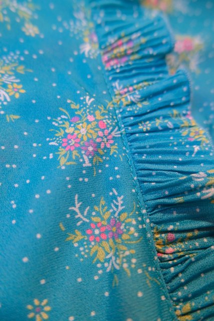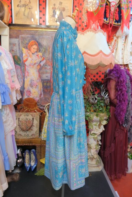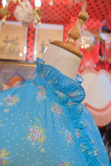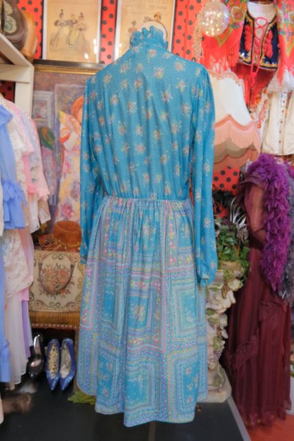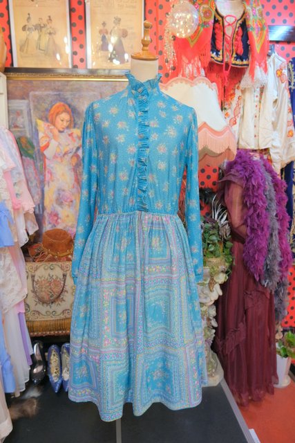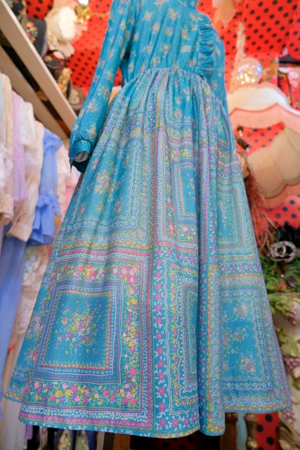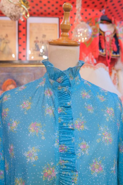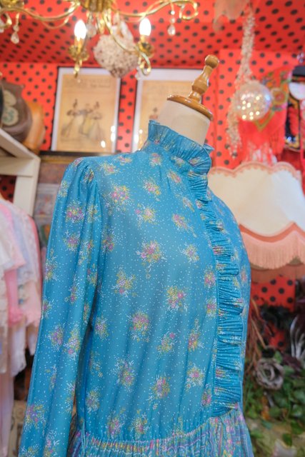 エレガントなフリル立ち襟にレトロガーリーな花柄プリントが魅力的な1970~80年代頃のヴィンテージワンピース