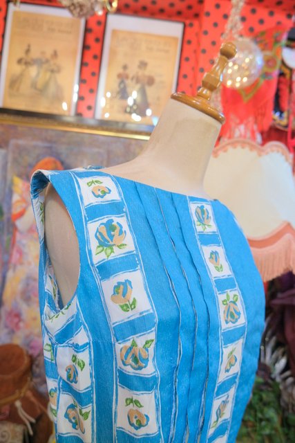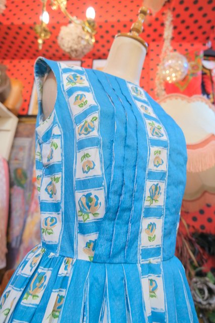エレガントでモダンさが際立つサブリナネックにガーリーな花柄やプリーツデザインがお洒落な1950年代頃のヨーロピアンヴィンテージワンピース