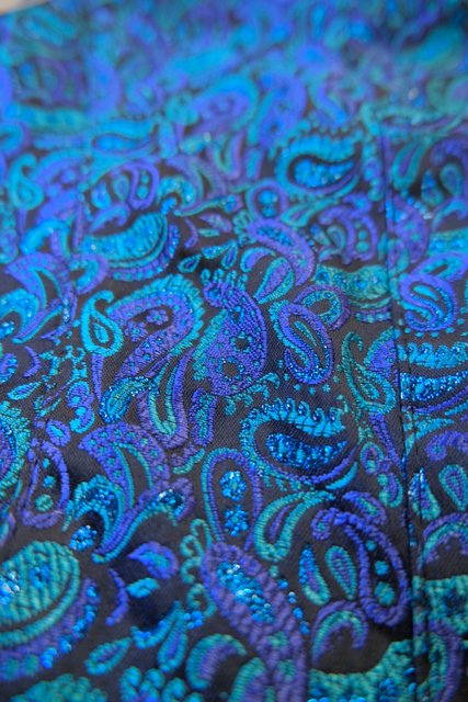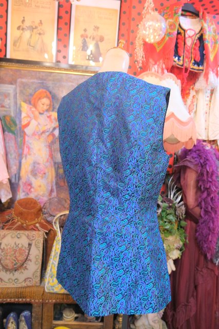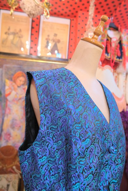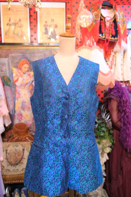 ラメ混じりのメタリックなペイズリー柄やくるみボタンがお洒落な1970~80年代頃のヨーロピアンヴィンテージベスト パーティーやイベント衣装におススメ!