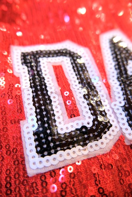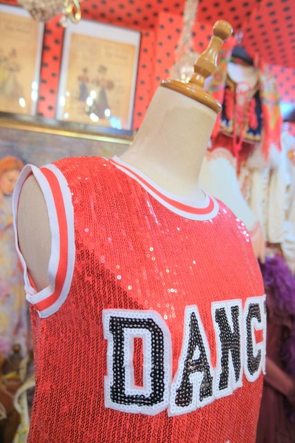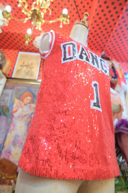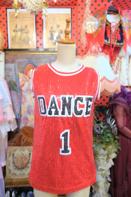 目を惹く赤いスパンコール×DANCEアップリケが可愛らしいヨーロピアンファンキートップス