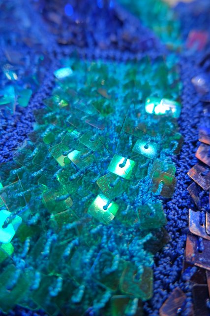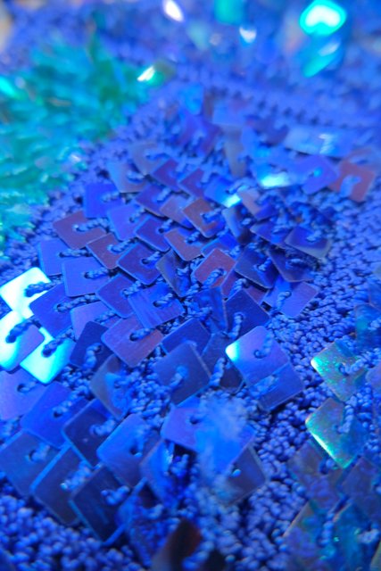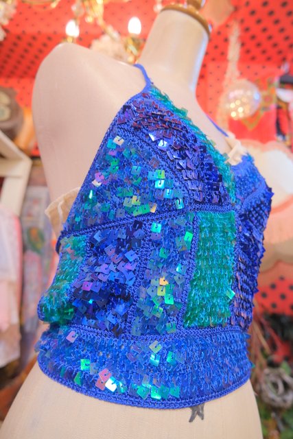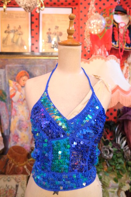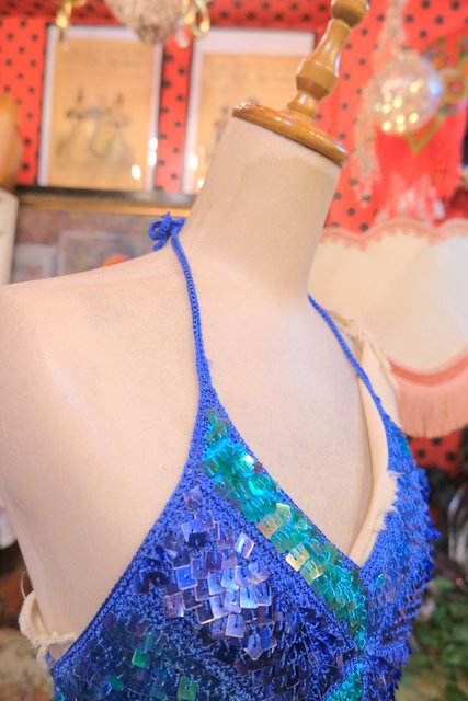 キラキラ輝くブルー、グリーンのスクエアスパンコールにホルターネックデザインが可愛いヨーロピアンパーティートップス