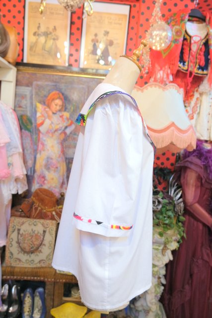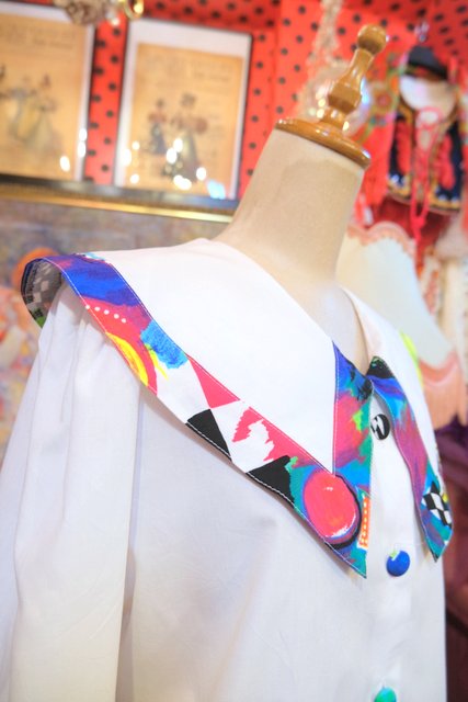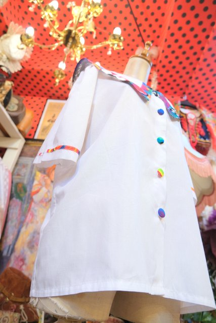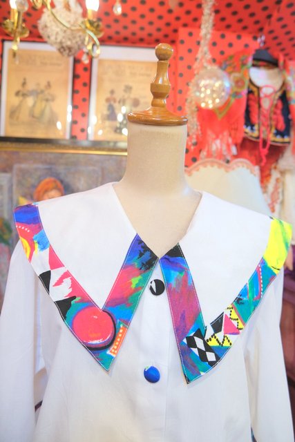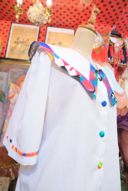 カラフルなピューリタンカラーやくるみボタンが目を惹く1980年代頃のヨーロピアンヴィンテージ半袖ブラウス