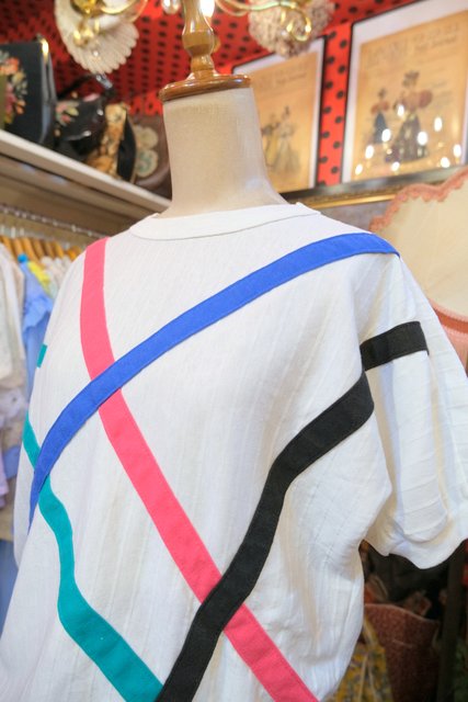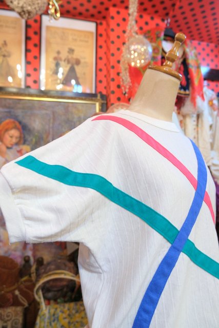 レトロ感たっぷりのストライプ生地×カラフルテープデザインが可愛らしい1980年代頃のヨーロピアンカットソー