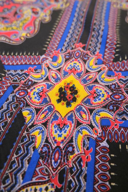 涼し気なテロっと感に黒ベース×カラフルなサイケデリック模様が目を惹くヨーロピアンフレアパンツ