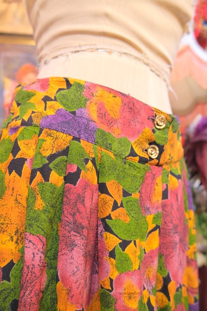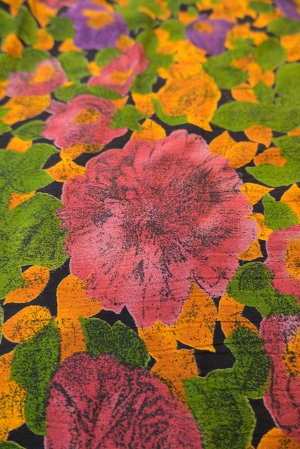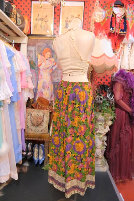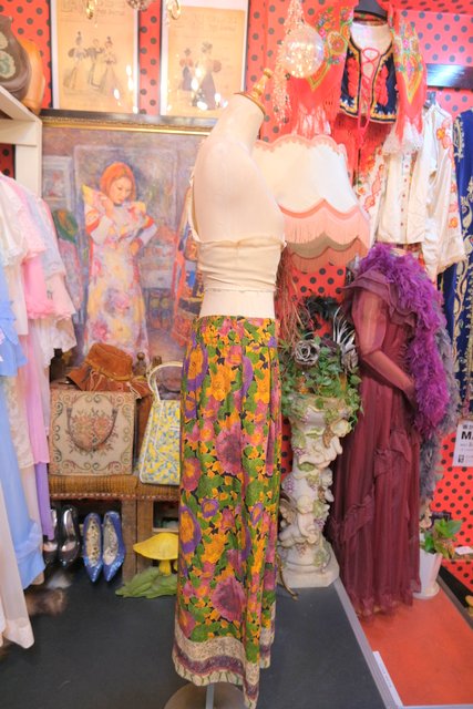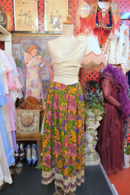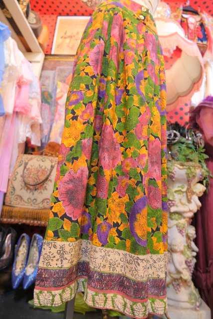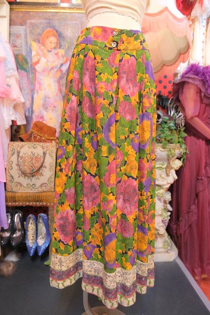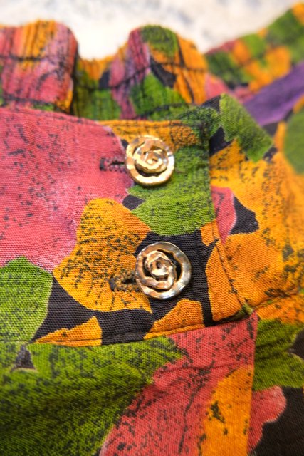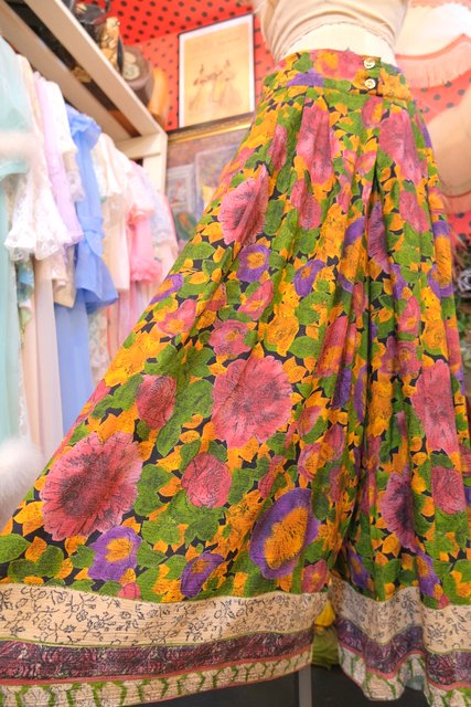レトロな花柄×裾のエスニック模様にお花ボタンやスカートのような広がりが魅力的な1980年代頃のUSA製ヴィンテージフレアパンツ