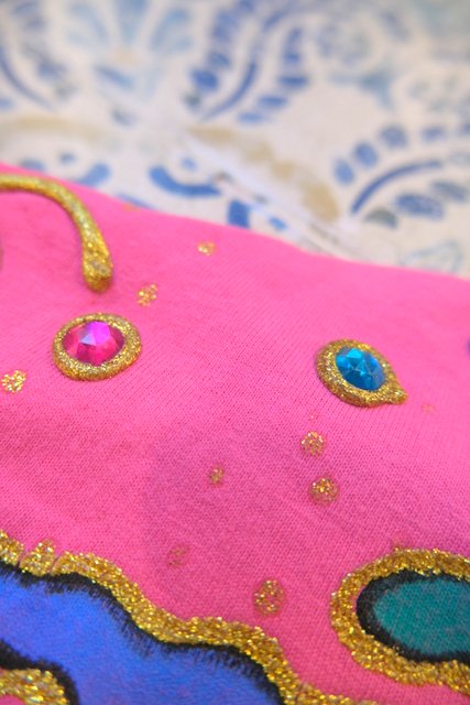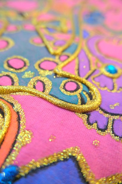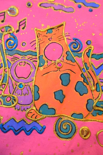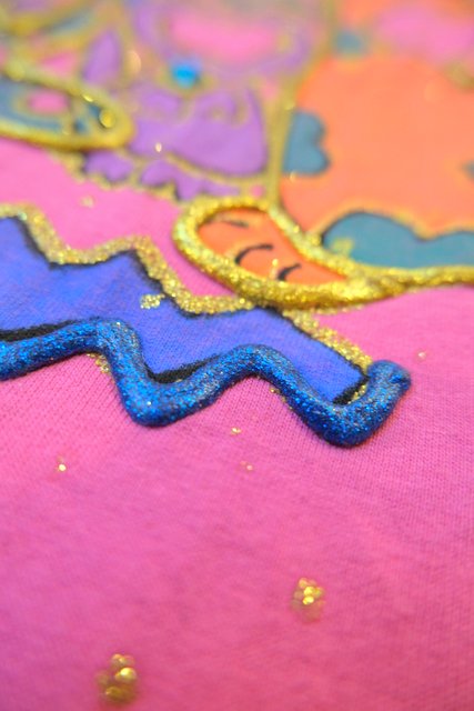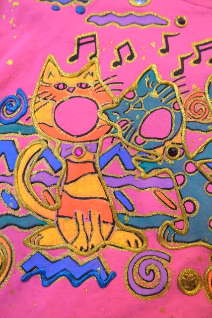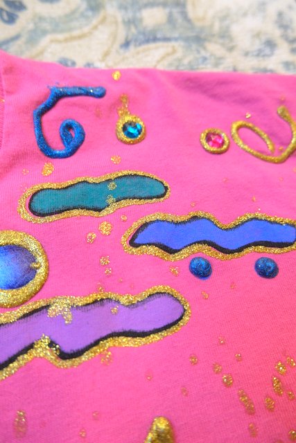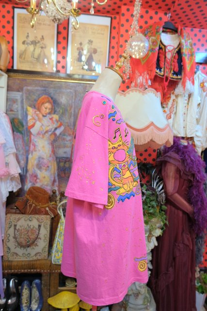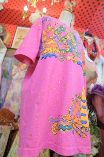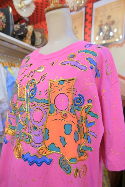 ピンクベースにゴールドモコモコペンで描かれたカラフルネコやビジュー付きが個性的な1980年代頃のUSA製ヴィンテージTシャツ