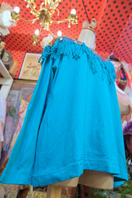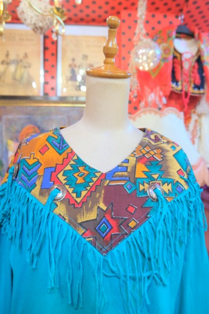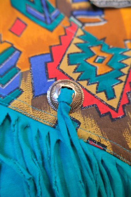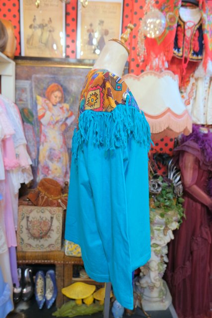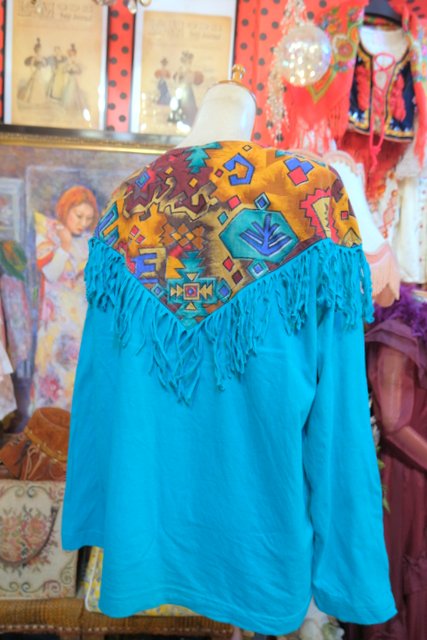 ターコイズベースにメキシカン生地×フリンジデザインが目を惹く1980年代頃のヨーロピアンカットソー
