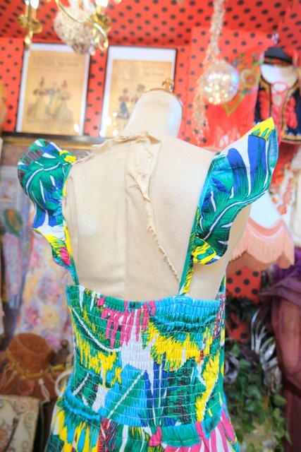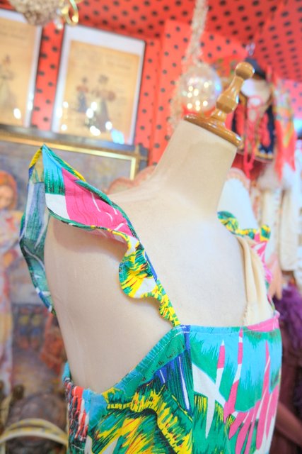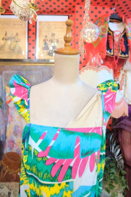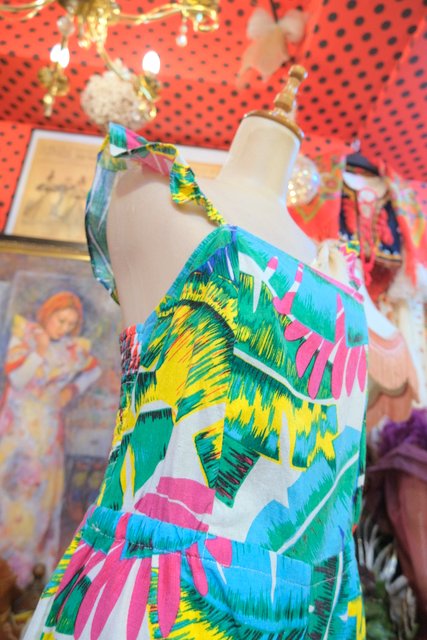 カラフルポップなボタニカル柄にフリルストラップが可愛らしいヨーロピアンリネンサロペット