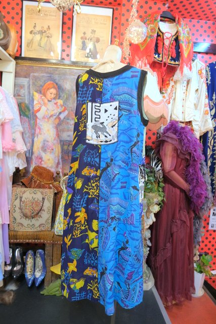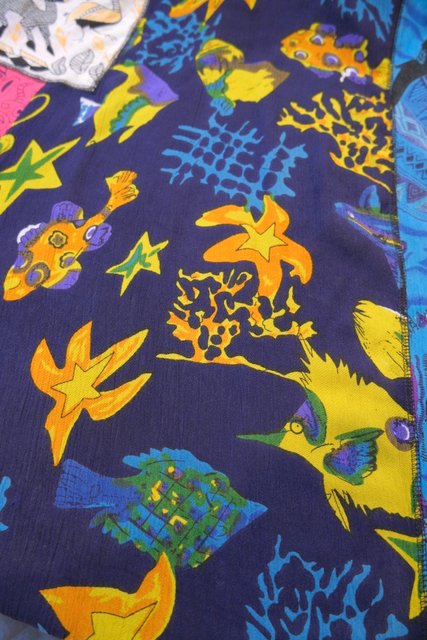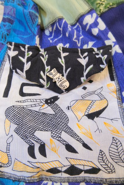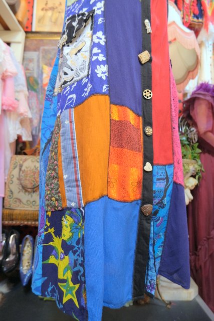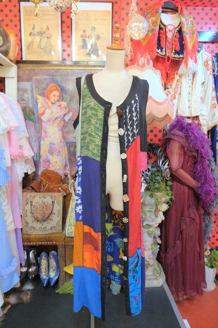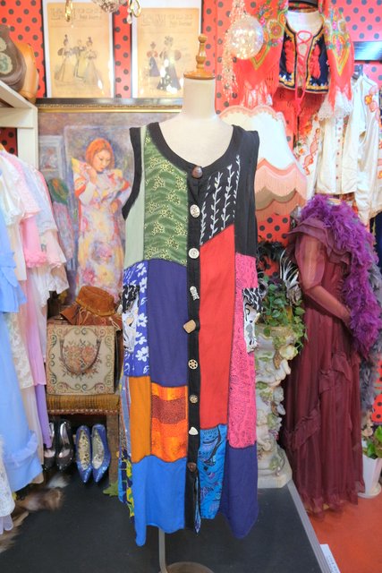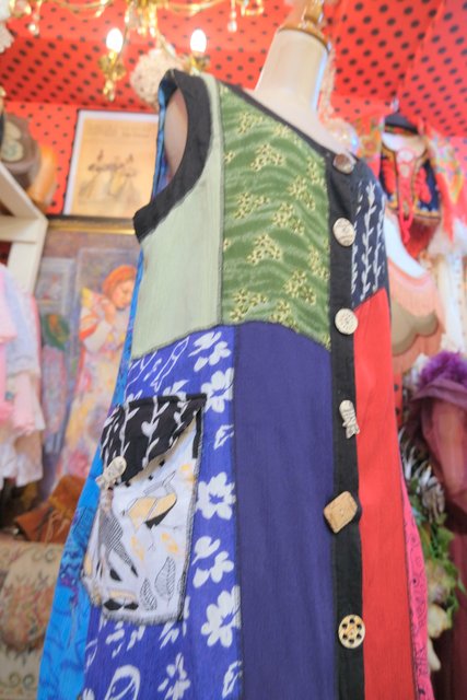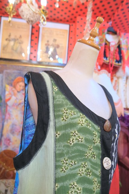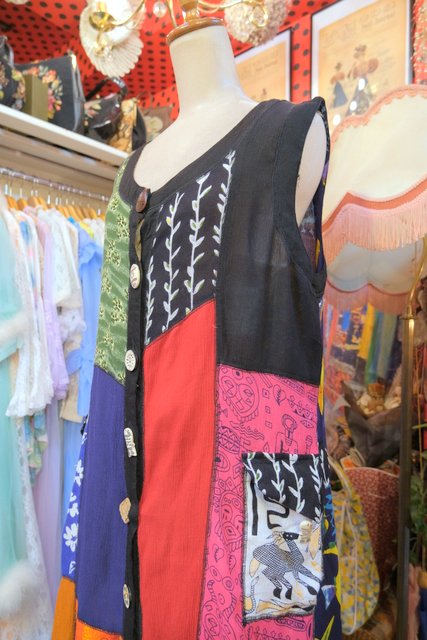 アフリカンや熱帯魚、エスニック生地のパッチワークデザインにユニークなウッドボタンが魅力的なヨーロピアンベストワンピース