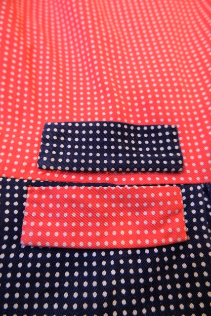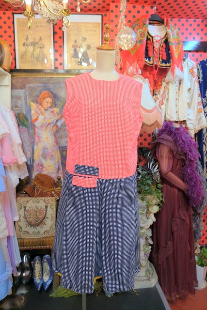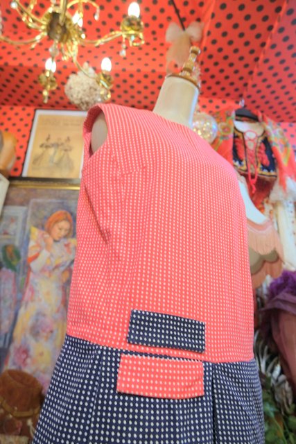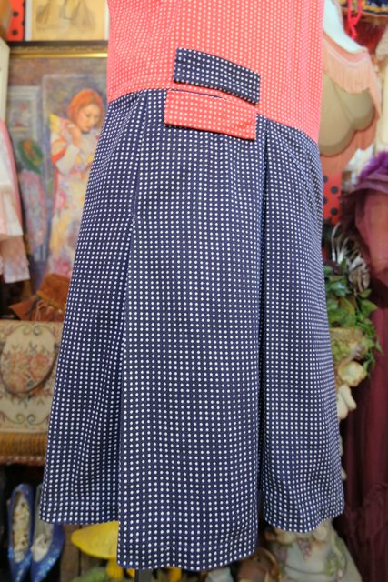 赤×ネイビーのドット切り替えデザインにボックスプリーツやポケットのような飾りが可愛らしいパリの老舗デパートGaleries Lafayetteヴィンテージワンピース