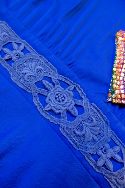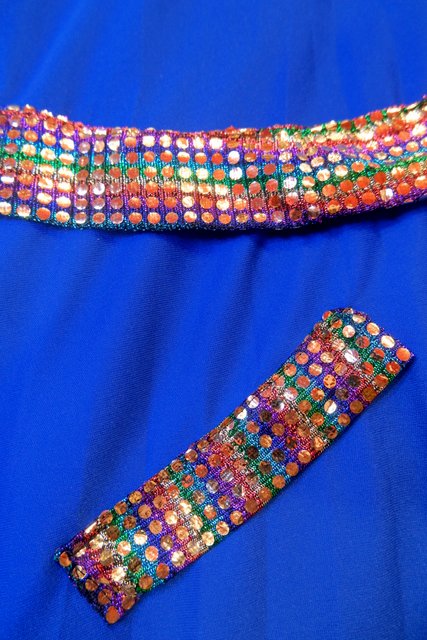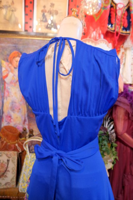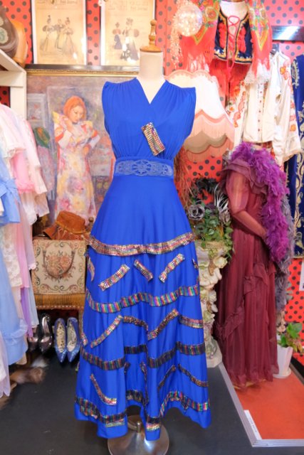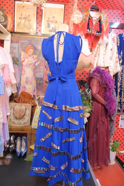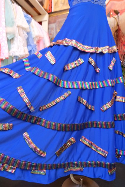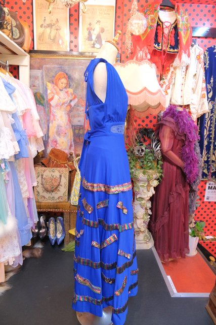 レース付きのエレガントなブルードレスにメタリックなレインボーカラーのパッチワークリメイクデザインがユニークな1970年代頃のヨーロピアンヴィンテージワンピース