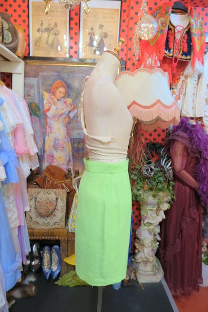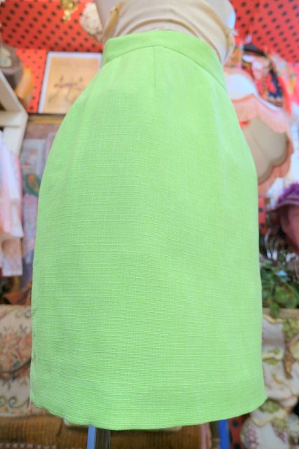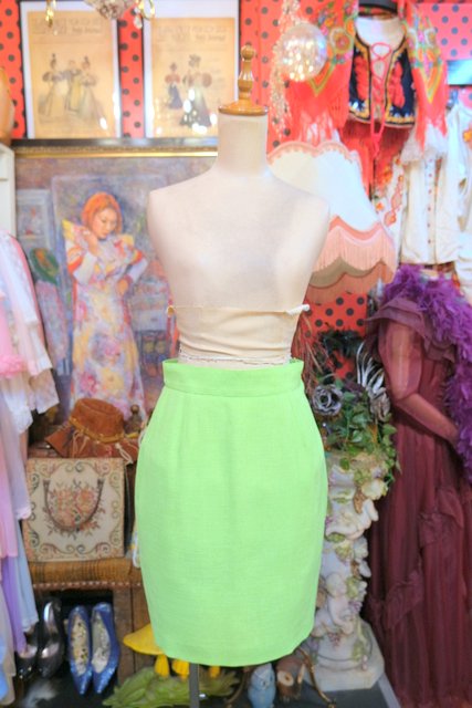 レトロポップな黄緑色にカジュアルからきれいめまで幅広く使えるタイトデザインが魅力的なフランスブランドMuglerスカート