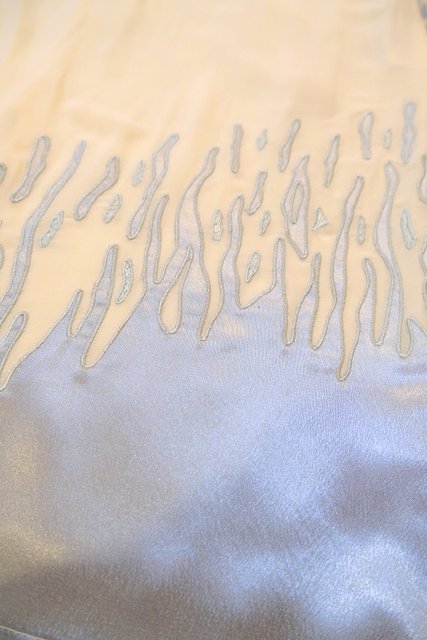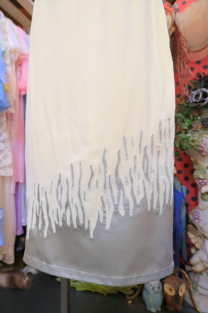 透け感がある淡いレモンクリーム色に光沢があるグレイのアートデザインが魅力的なヨーロピアンタイトスカート