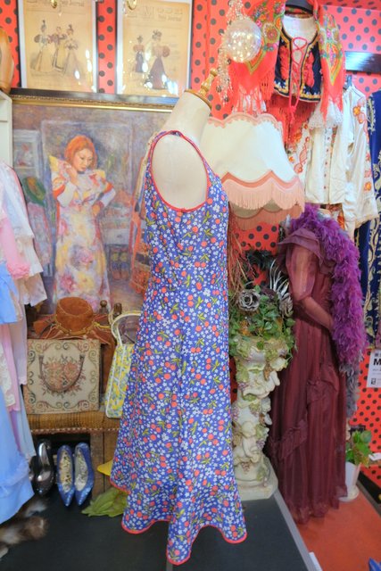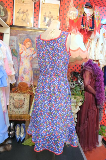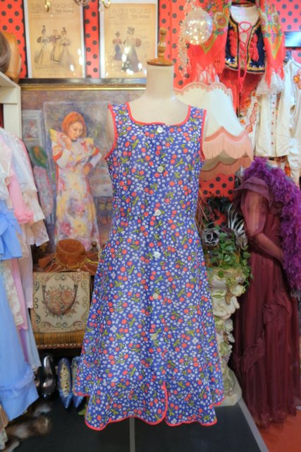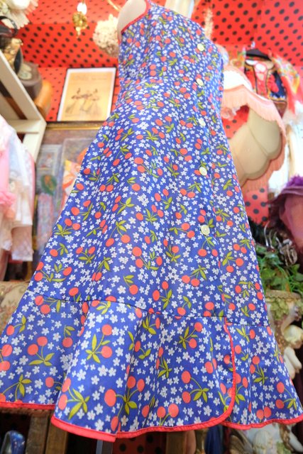 レトロポップなチェリーや花柄プリントに裾のフリルデザインが可愛らしい1970年代頃のヨーロピアンヴィンテージエプロンワンピース
