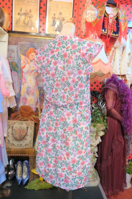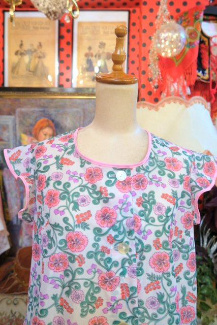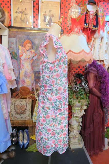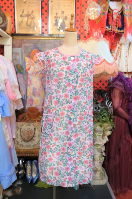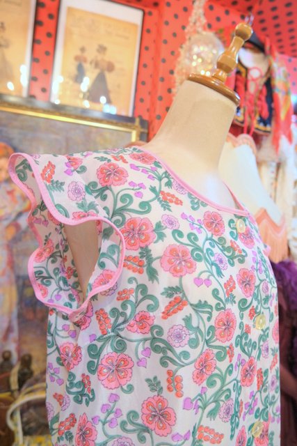 レトロ感たっぷりの花柄プリントにフリルデザインが可愛らしい1970年代頃のヨーロピアンヴィンテージエプロンワンピース