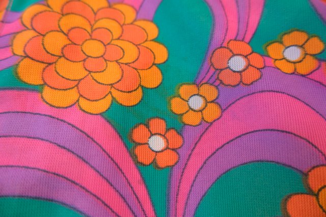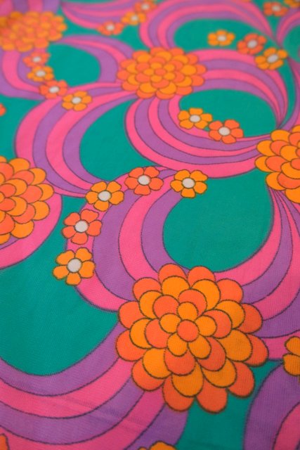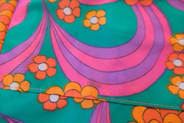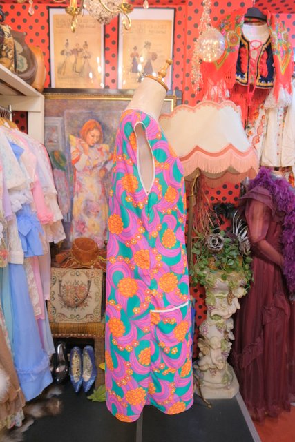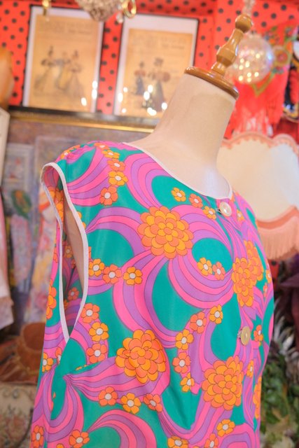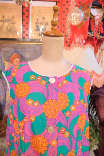 ポップでサイケデリックな花柄マーブルプリントが目を惹く1970年代頃のヨーロピアンヴィンテージエプロンワンピース