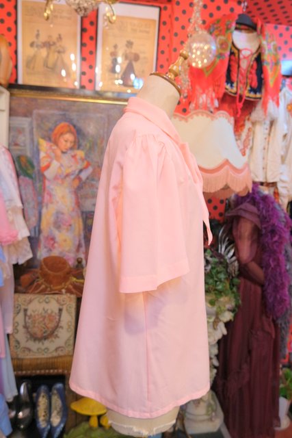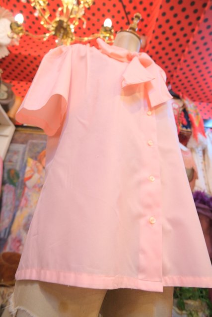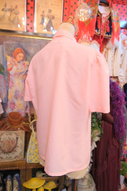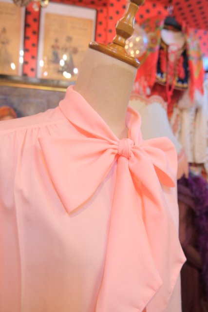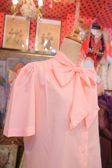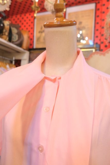 ガーリーなピンクベースにエレガントにもマニッシュな印象にもなるリボンスカーフカラーが魅力的な1970~80年代頃のヨーロピアンヴィンテージ半袖ブラウス