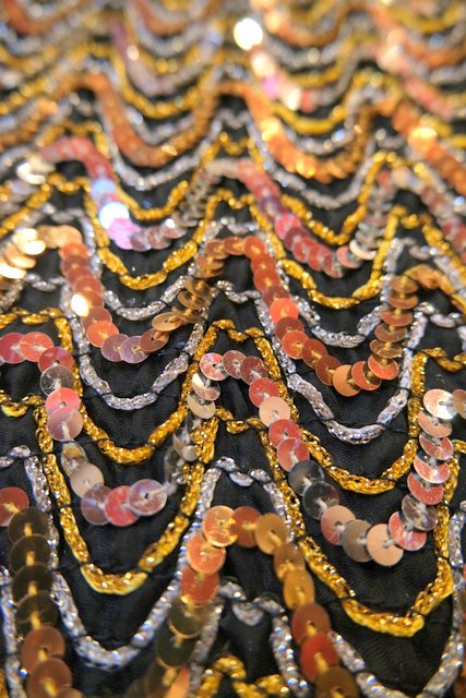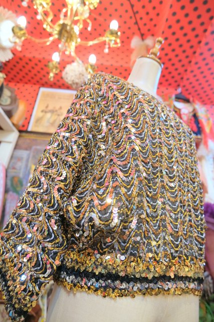 透け感がある生地にゴールド×シルバーのラメテープやスパンコールデザインが魅力的な1980年代頃のヴィンテージドルマンスリーブパーティートップス