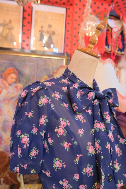 ヨーロッパ古着70sレトロガーリー花柄ボウタイブラウス
