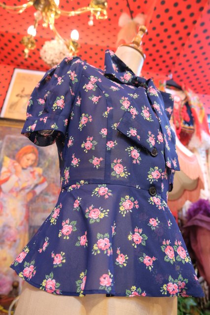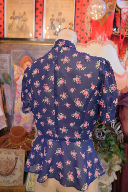 華やかな花柄プリントにパフスリーブやリボンボウタイデザインが可愛らしい1970年代頃のヨーロピアンペプラムブラウス
