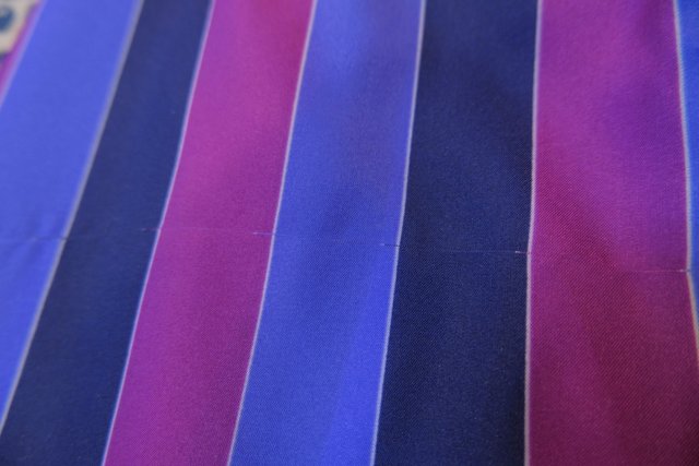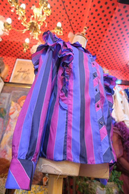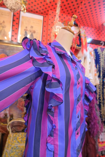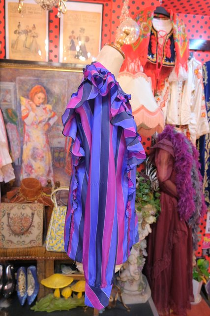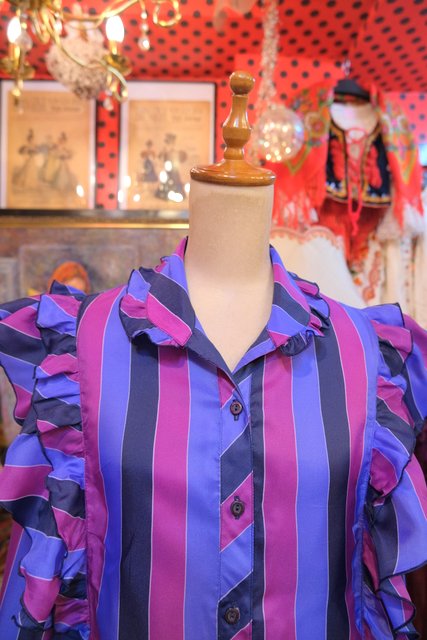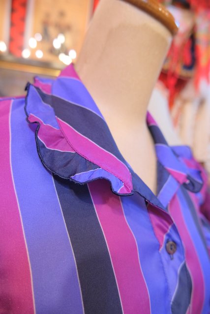パープルベースの濃淡カラーにボリュームフリルデザインがお洒落で個性的な1980年代頃のヨーロピアンヴィンテージブラウス