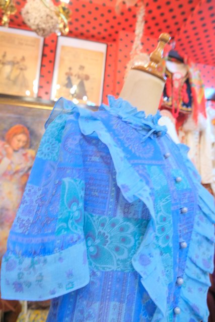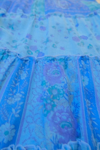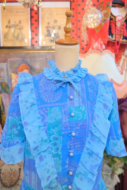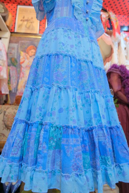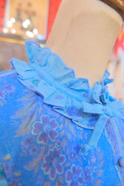 涼し気な水色、ブルーベースにロマンティックガーリーなフリル襟やティアードスカートが可愛らしい1970年代頃のヨーロピアンヴィンテージワンピース