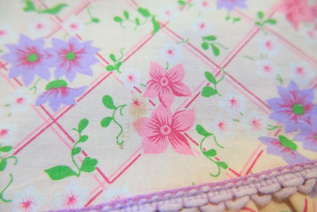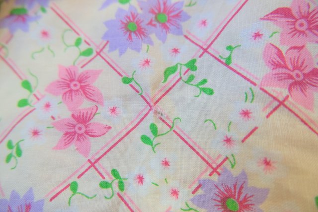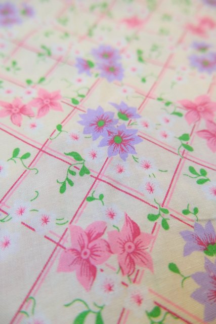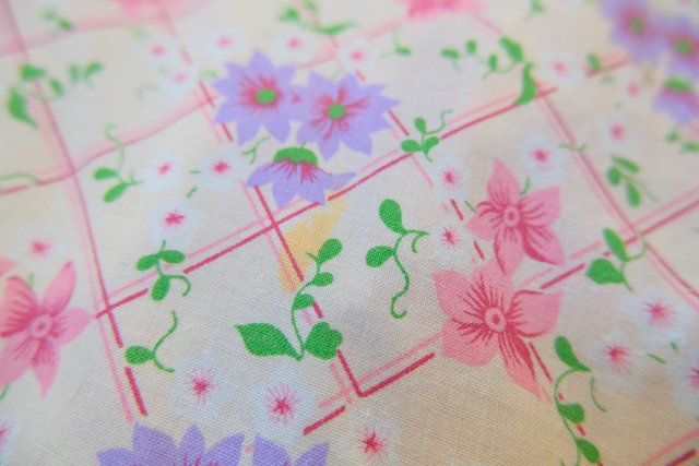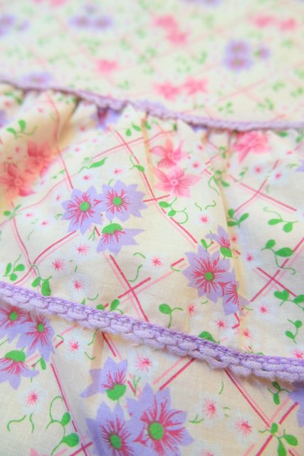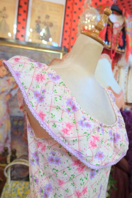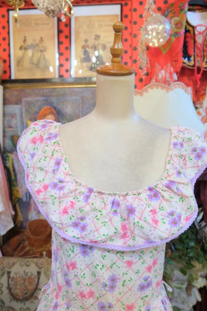 ピンク、パープルの花柄×チェックプリントにラバティンカラーが可愛らしい1970年代頃のヨーロピアンヴィンテージワンピース