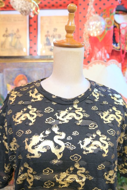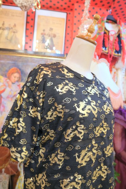 インパクトたっぷりのゴールド龍プリントにダメージ加工×シフォン生地のレイヤードデザインが魅力的なヨーロピアン和モダンファンキーTシャツ