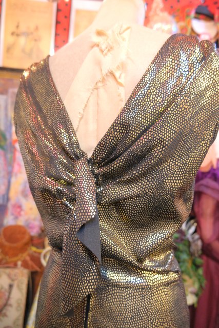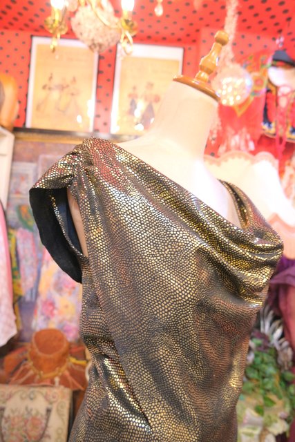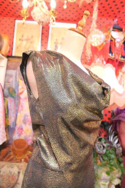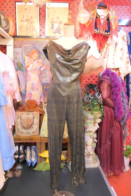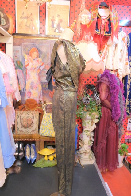 メタリックなゴールド生地にドレープ感がある首周りのショールデザインが素敵な1980年代頃のヨーロピアンヴィンテージジャンプスーツ