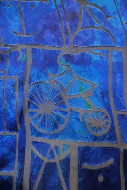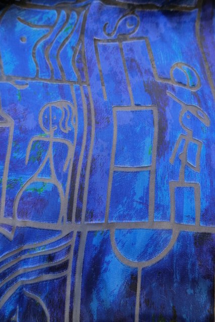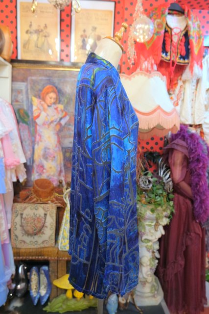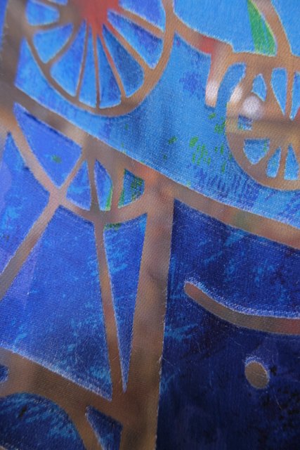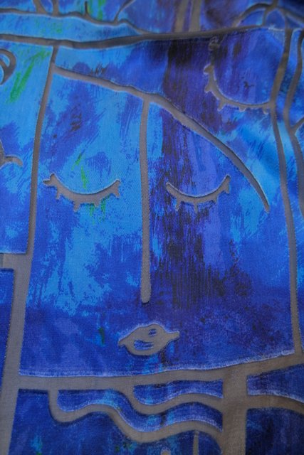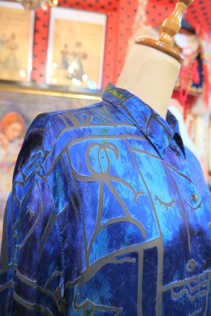 光沢があるパープル、黄緑まじりのブルーベースに透け感があるポップなアートデザインが魅力的な1980年代頃のヨーロピアンオーバーサイズシャツ