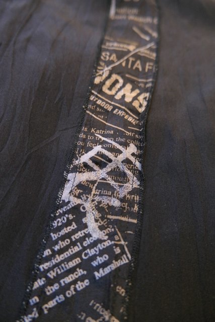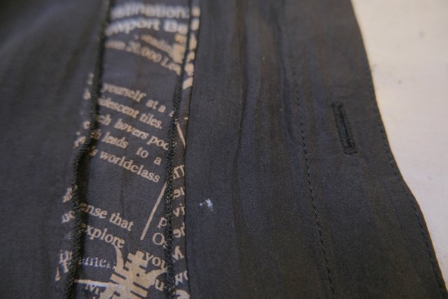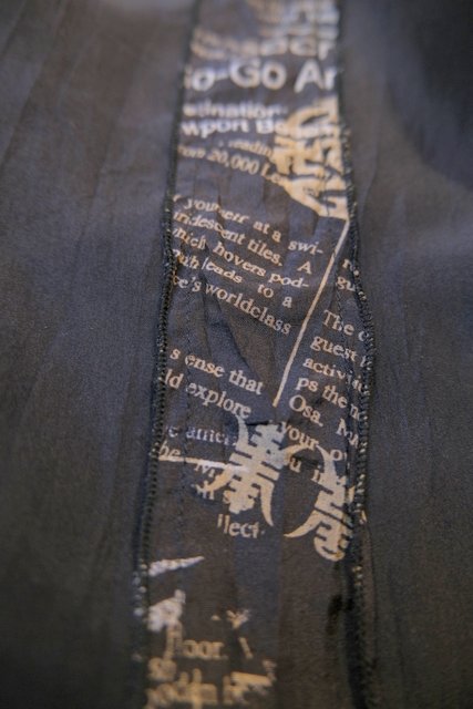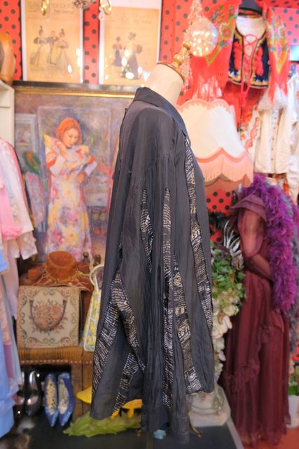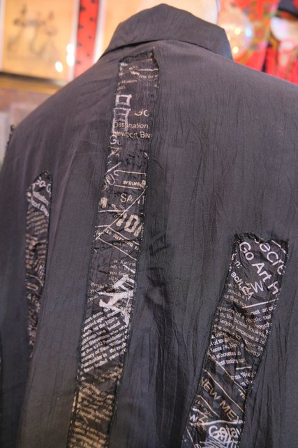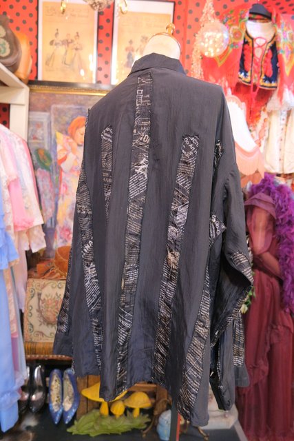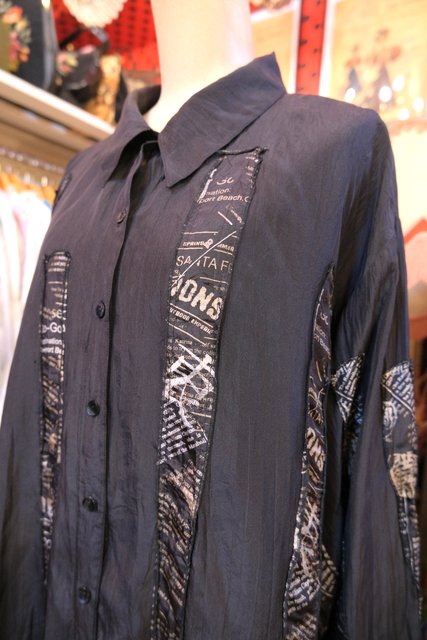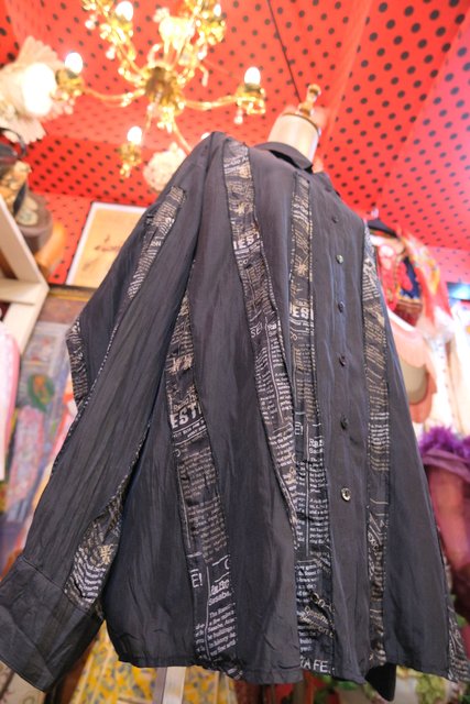 シワ感がある滑らかなシルク生地にニュースペーパーのパッチワークデザインがカッコいい1980年代頃のヨーロピアンオーバーサイズシャツ
