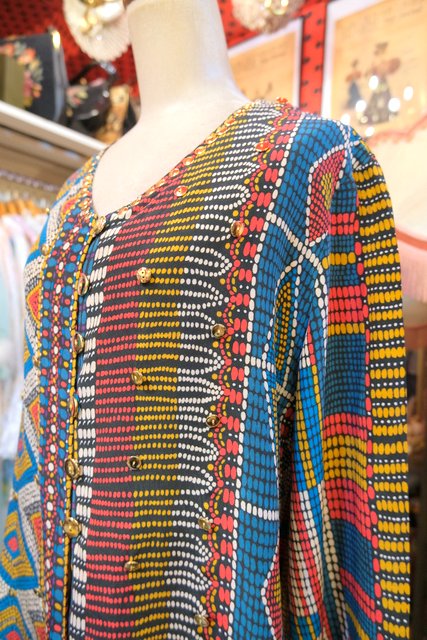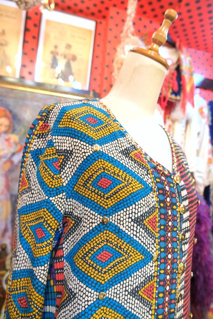 テロっとした落ち感にカラフルな総柄やゴールドボタン、両サイド裾のフリンジデザインが可愛らしい1980年代頃のヨーロピアンシャツカーディガン