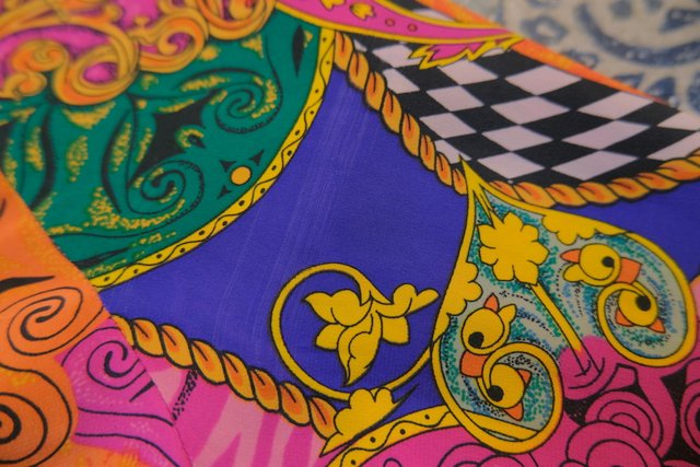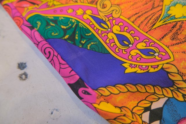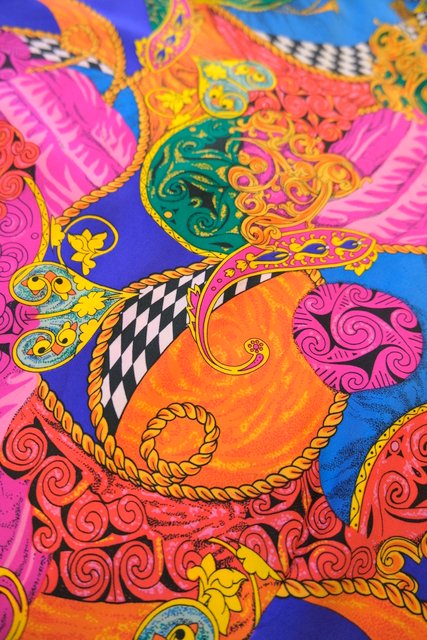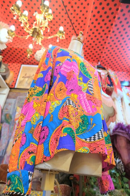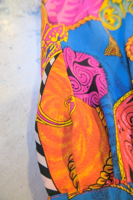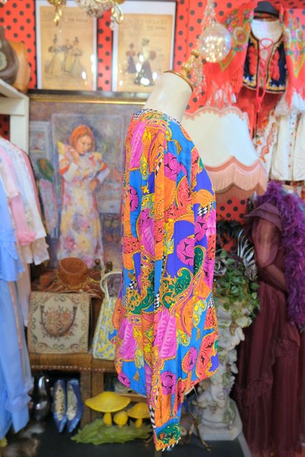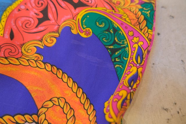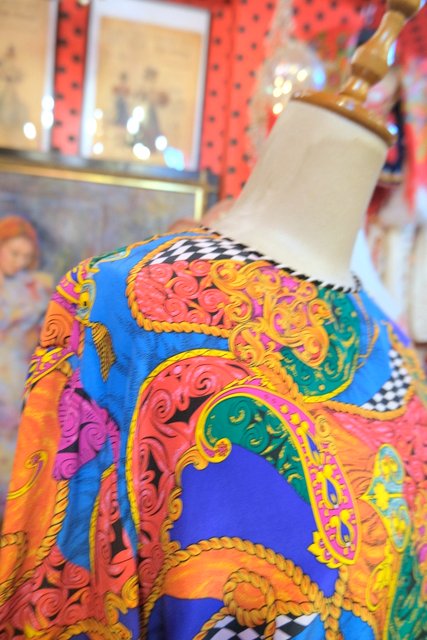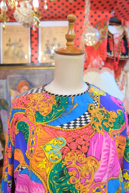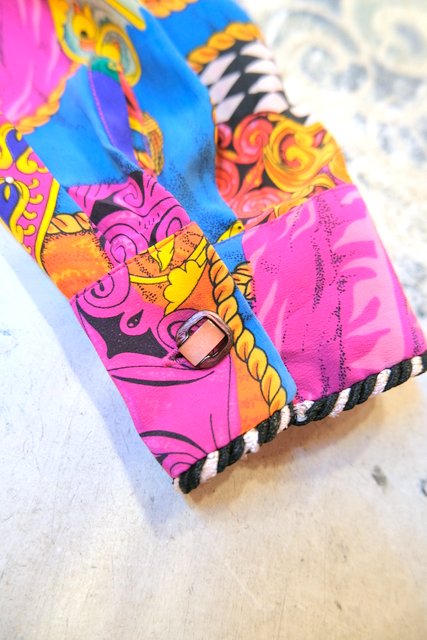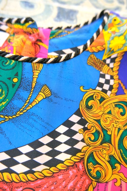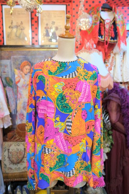目を惹くカラフルなゴージャス柄に首周り、袖先のロープデザインがお洒落な1980年代頃のヨーロピアンシルクブラウス