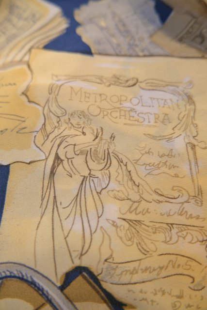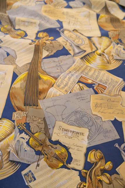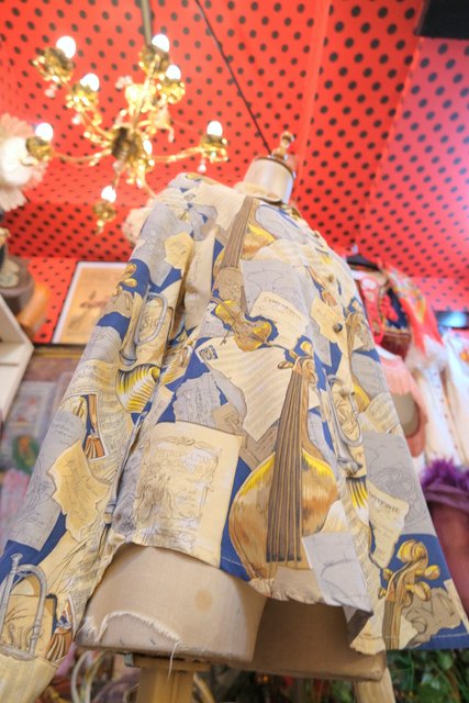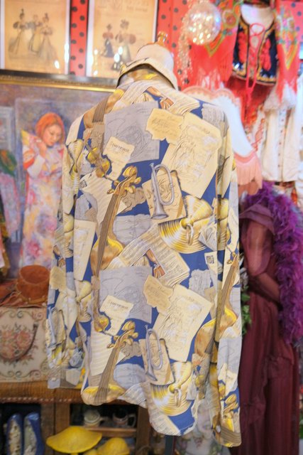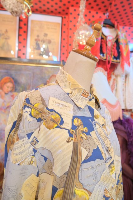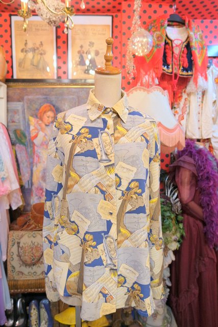 レトロ感たっぷりのバイオリン、ホルン、楽譜プリントが魅力的なヨーロピアンシルクオーバーサイズシャツ